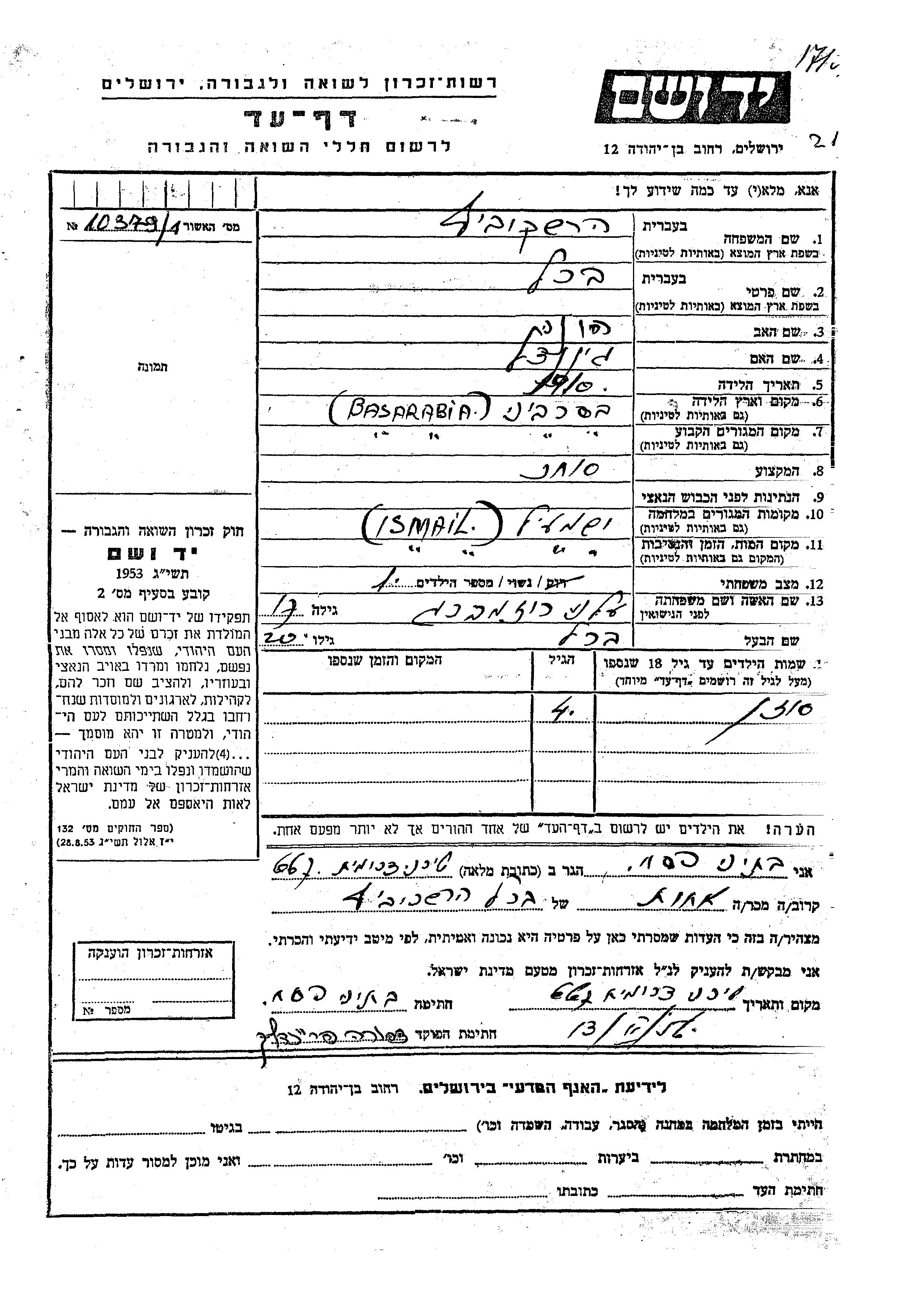 Berl Hershkovitz est né à Bessarabia, Roumanie en 1910, fils de Ginendel. Il était Commerçant/e et Mariée à Eleni née Rozemberg. Au cours de la guerre, il était à Ismail, Roumanie.