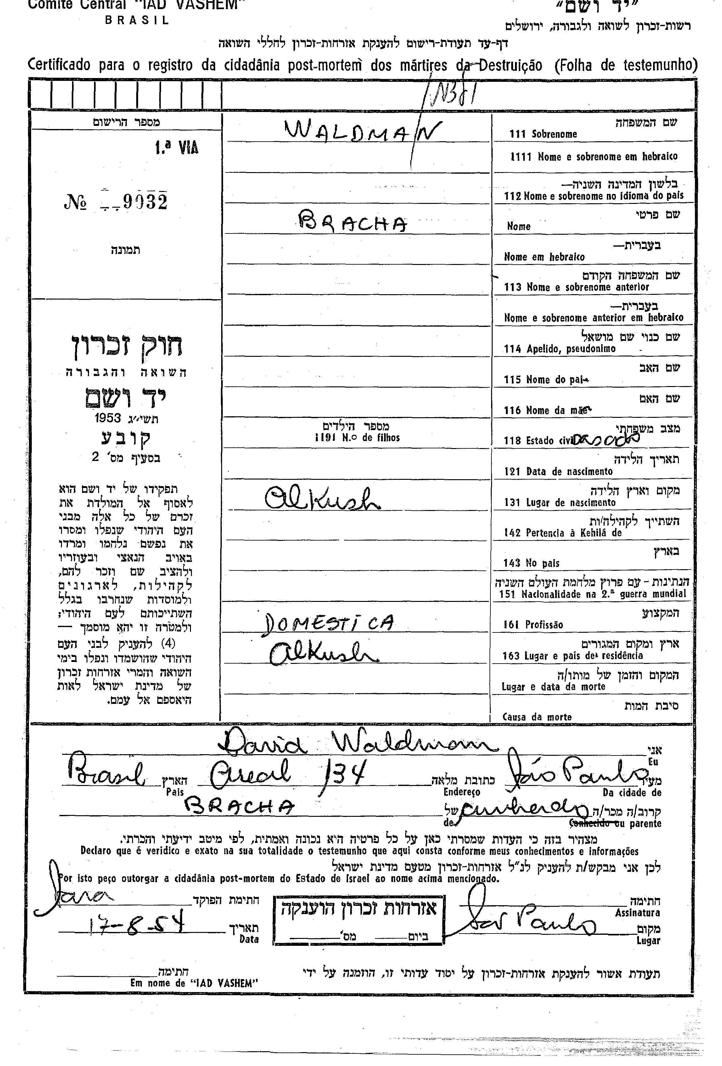 Waldman Bracha Olkusz, Pologne Feuille de témoignage