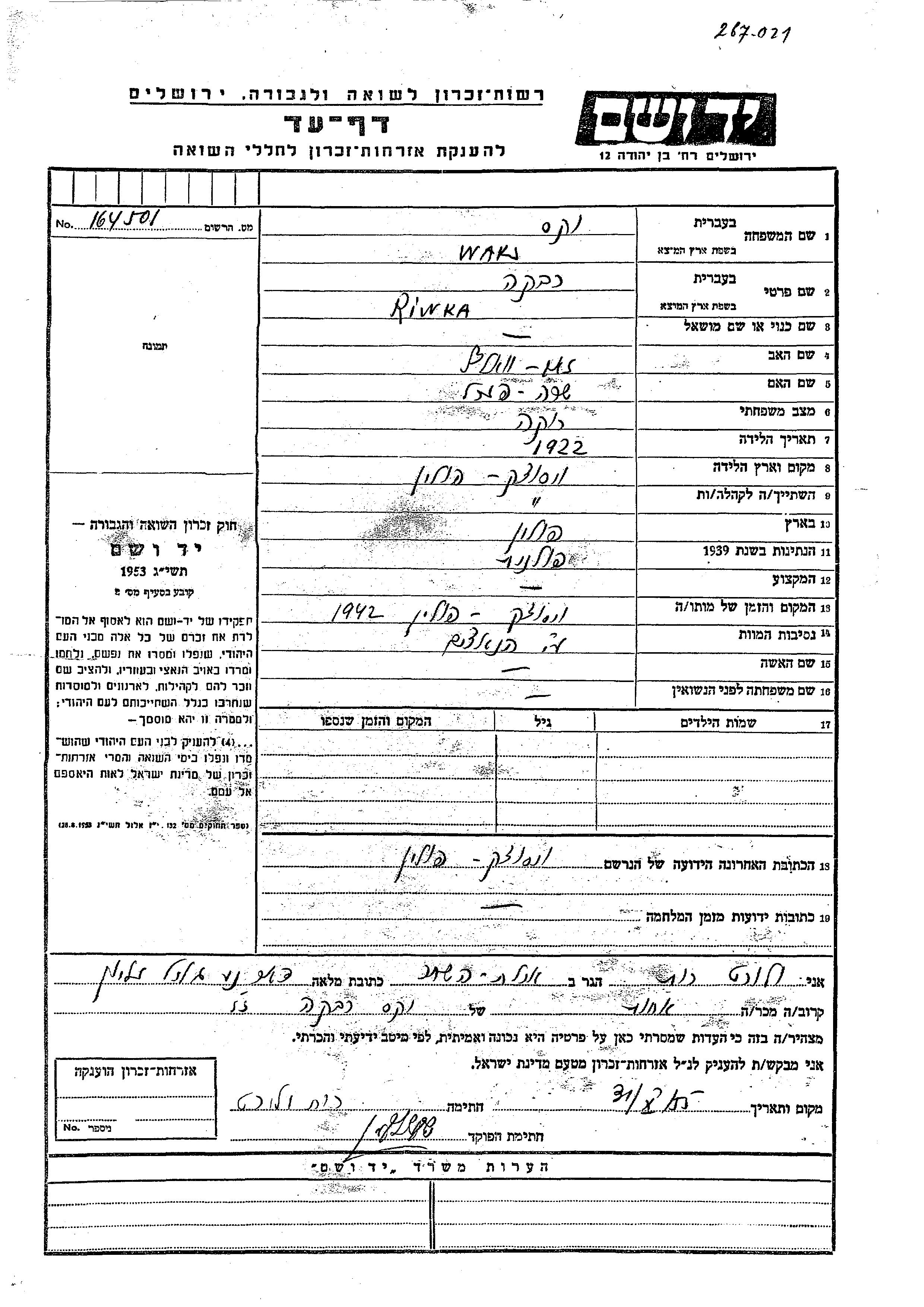 Waks Riwka 1922 Wysock, Pologne Feuille de témoignage