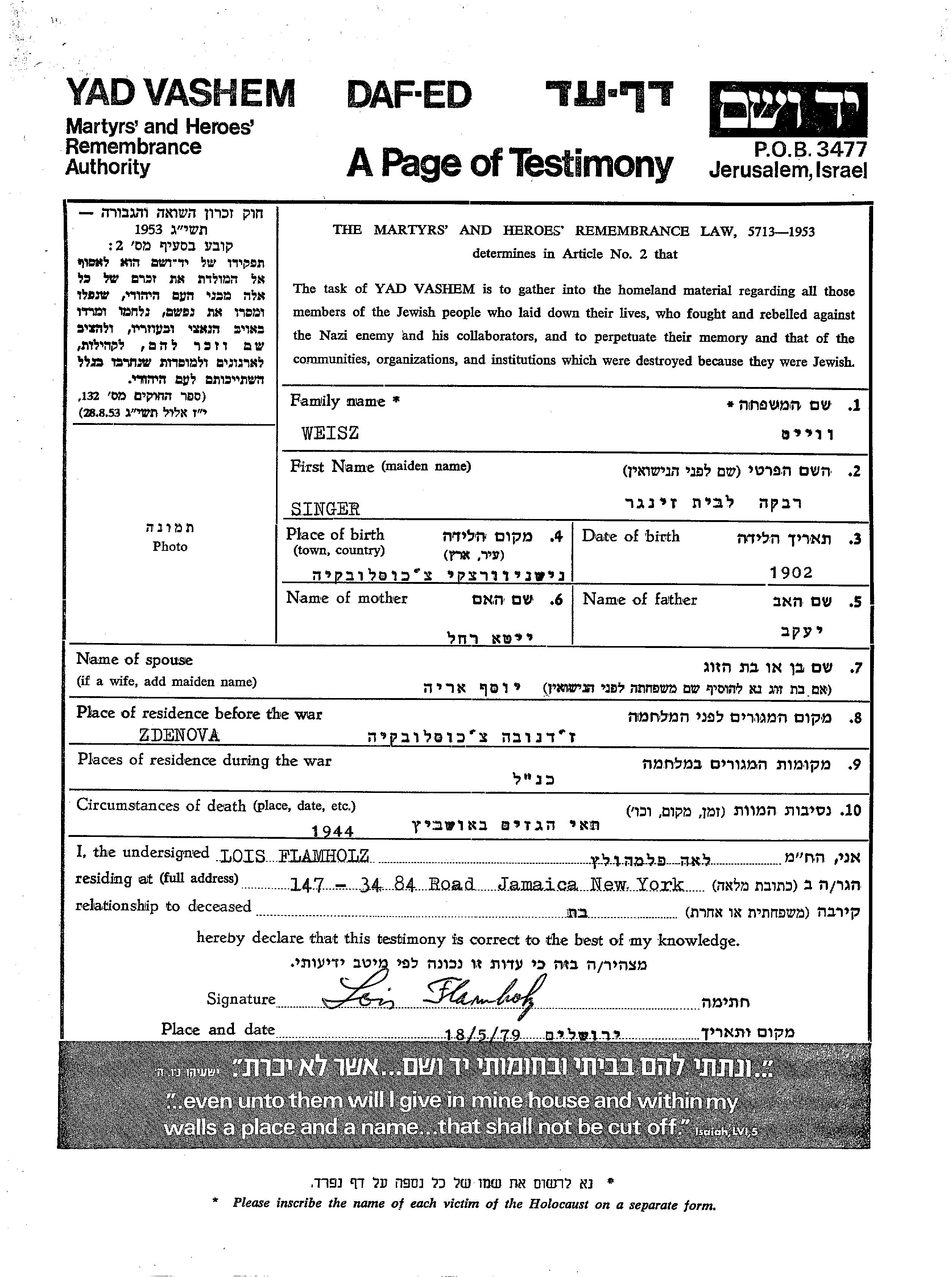 Rivka Weisz née Singer est née à Nizni Verecky, Tchécoslovaquie en 1902, fille de Yaakov et de Yehudit Rakhel. Elle était Mariée à Yosef Arie. Avant la seconde guerre mondiale elle vivait à Zdenovo, Tchécoslovaquie. Pendant la guerre, elle était à Zdenovo, Tchécoslovaquie.