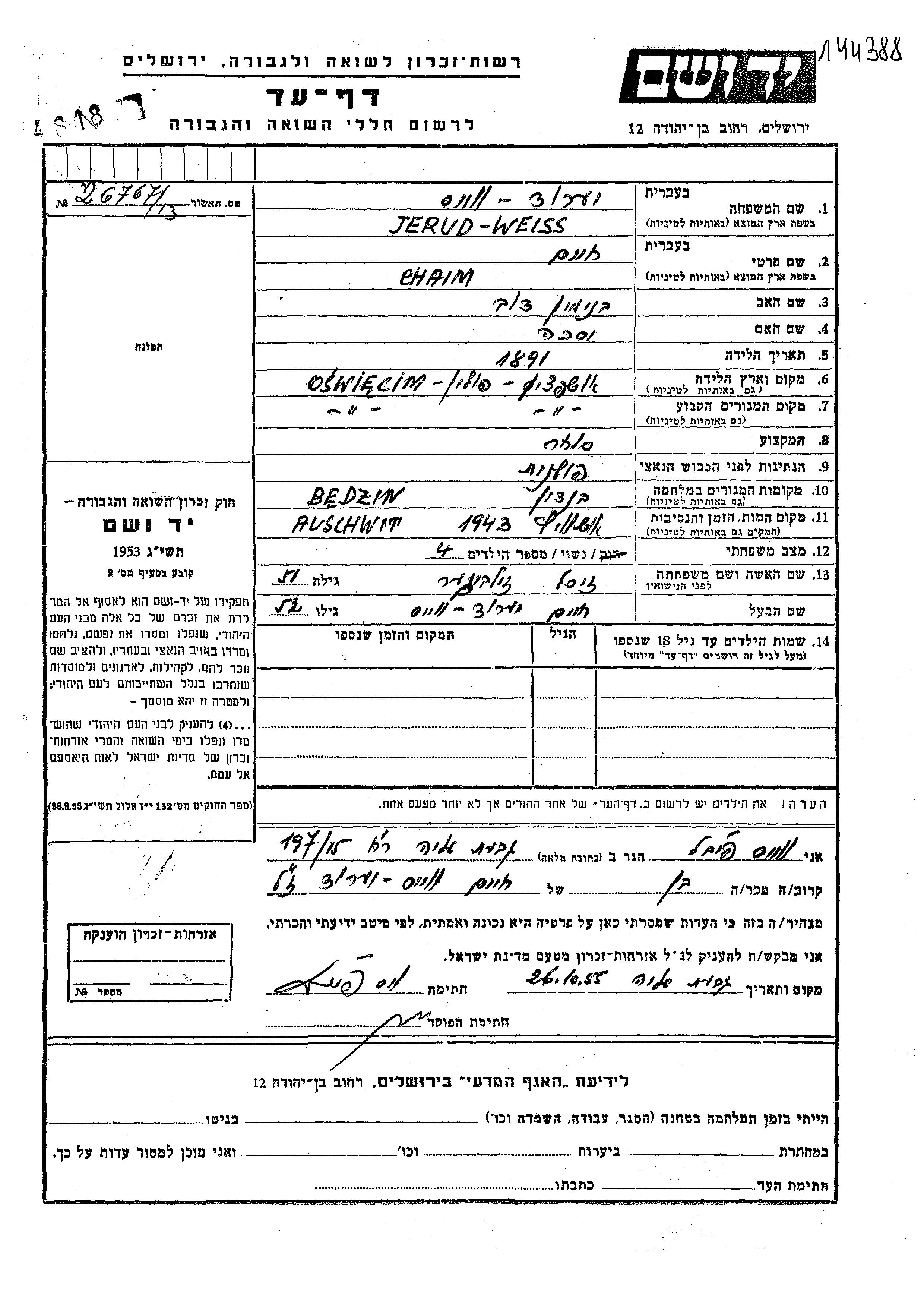 Jerud Weiss Chaim 1891 Oświęcim, Pologne Feuille de témoignage