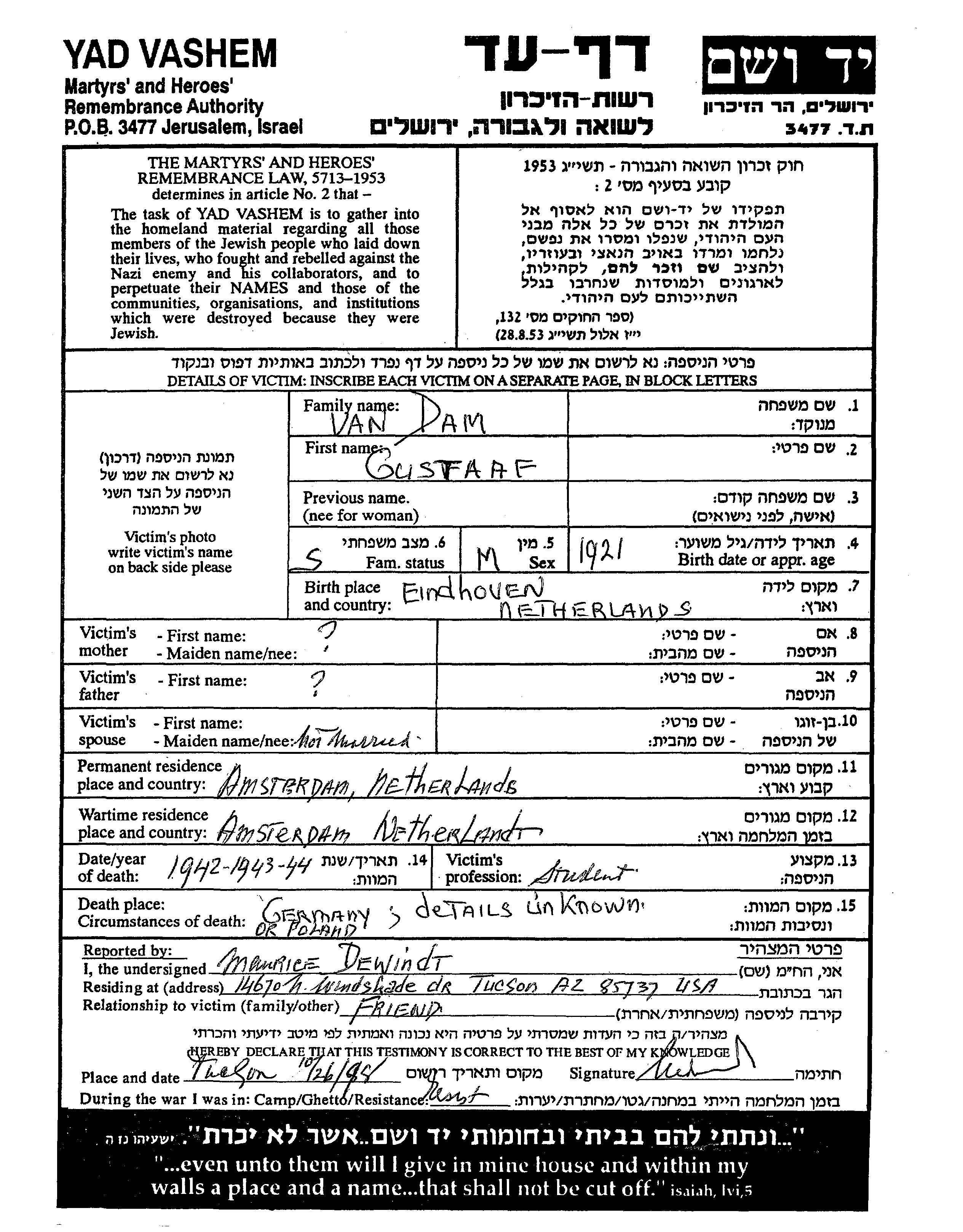 Gustaaf Dam van est né à Eindhoven, Pays-Bas en 1921. Il était Étudiant/e et Célibataire. Avant la seconde guerre mondiale il vivait à Amsterdam, Pays-Bas. Au cours de la guerre, il était à Amsterdam, Pays-Bas.