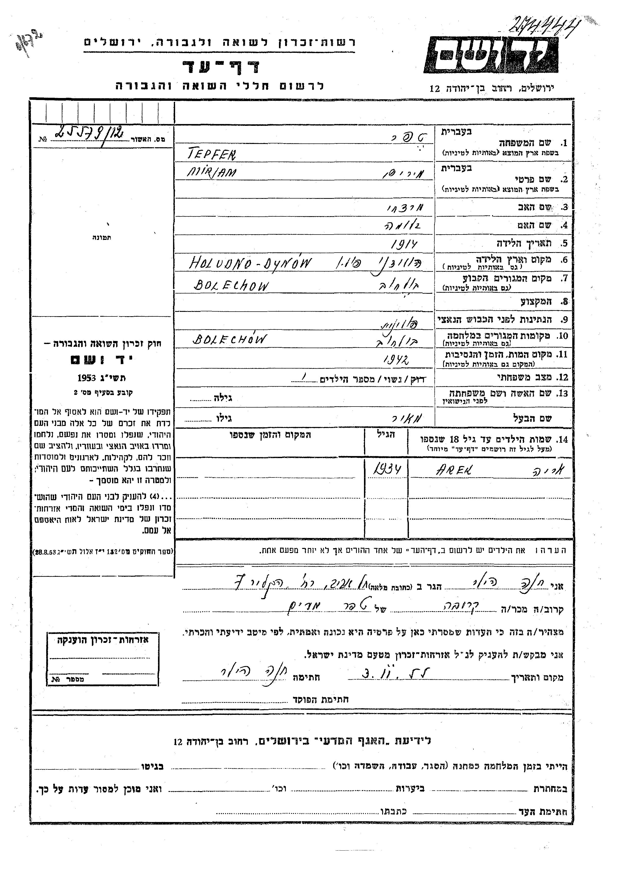 Tepfer Teper Mirjam 1914 Bolechov, Pologne Feuille de témoignage