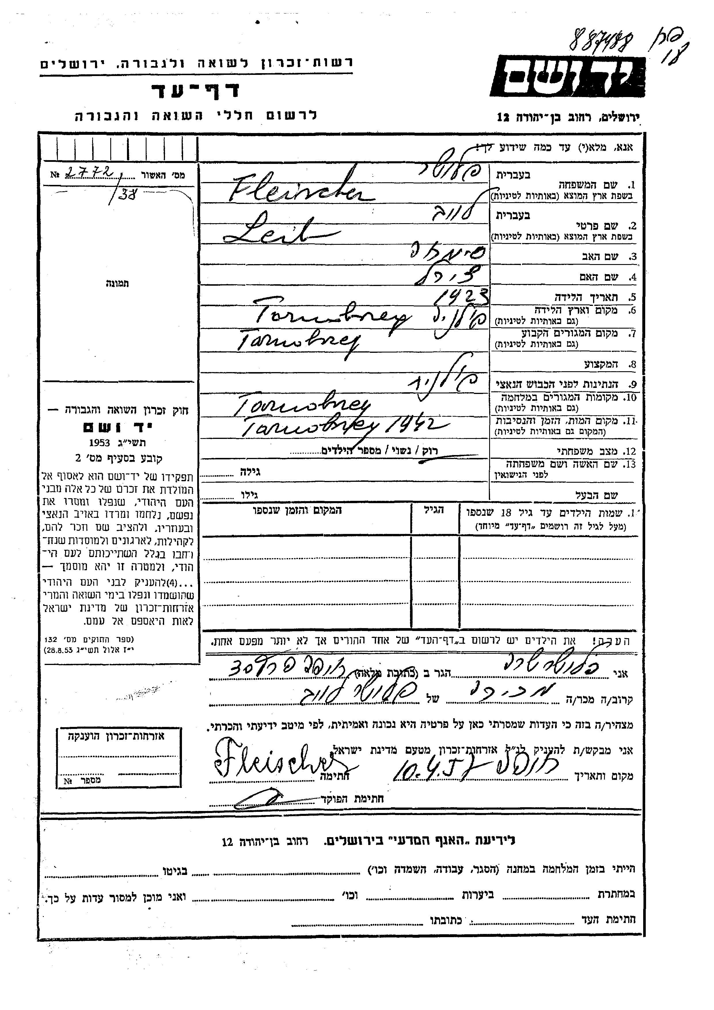 Fleischer Felisher Leib 1923 Tarnobrzeg, Pologne Feuille de témoignage