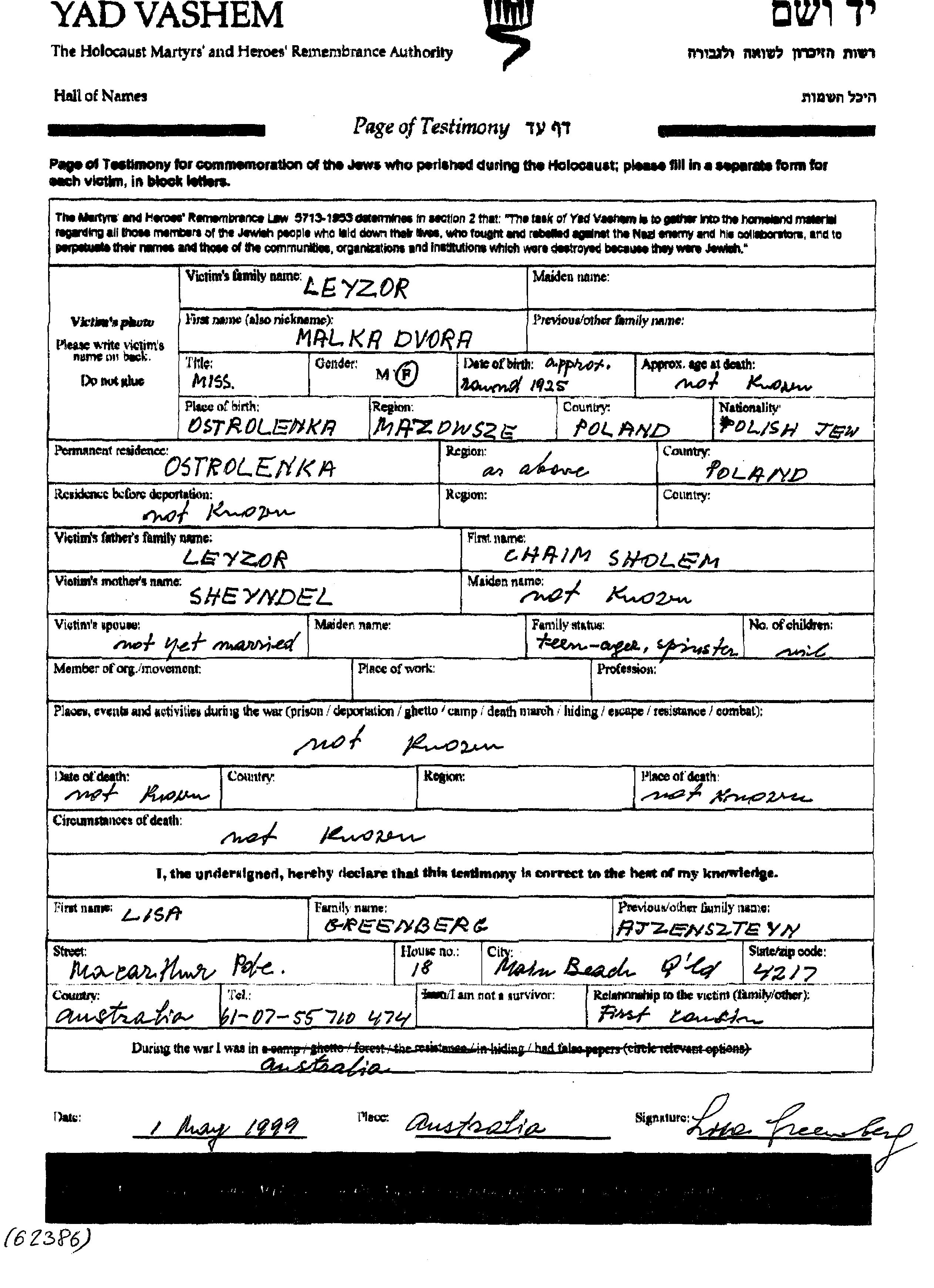 Leyzor Malka Dvora 1925 Ostrolenka, Pologne Feuille de témoignage