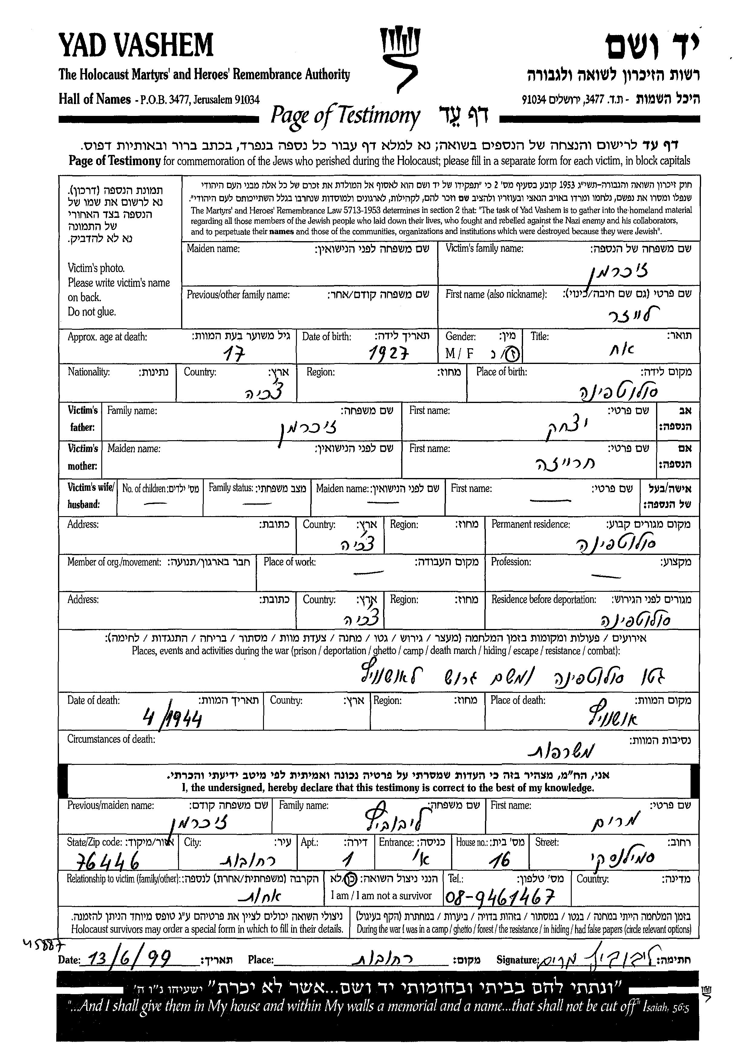 Yad Vashem - Pages of Testimony Names Memorial Collection