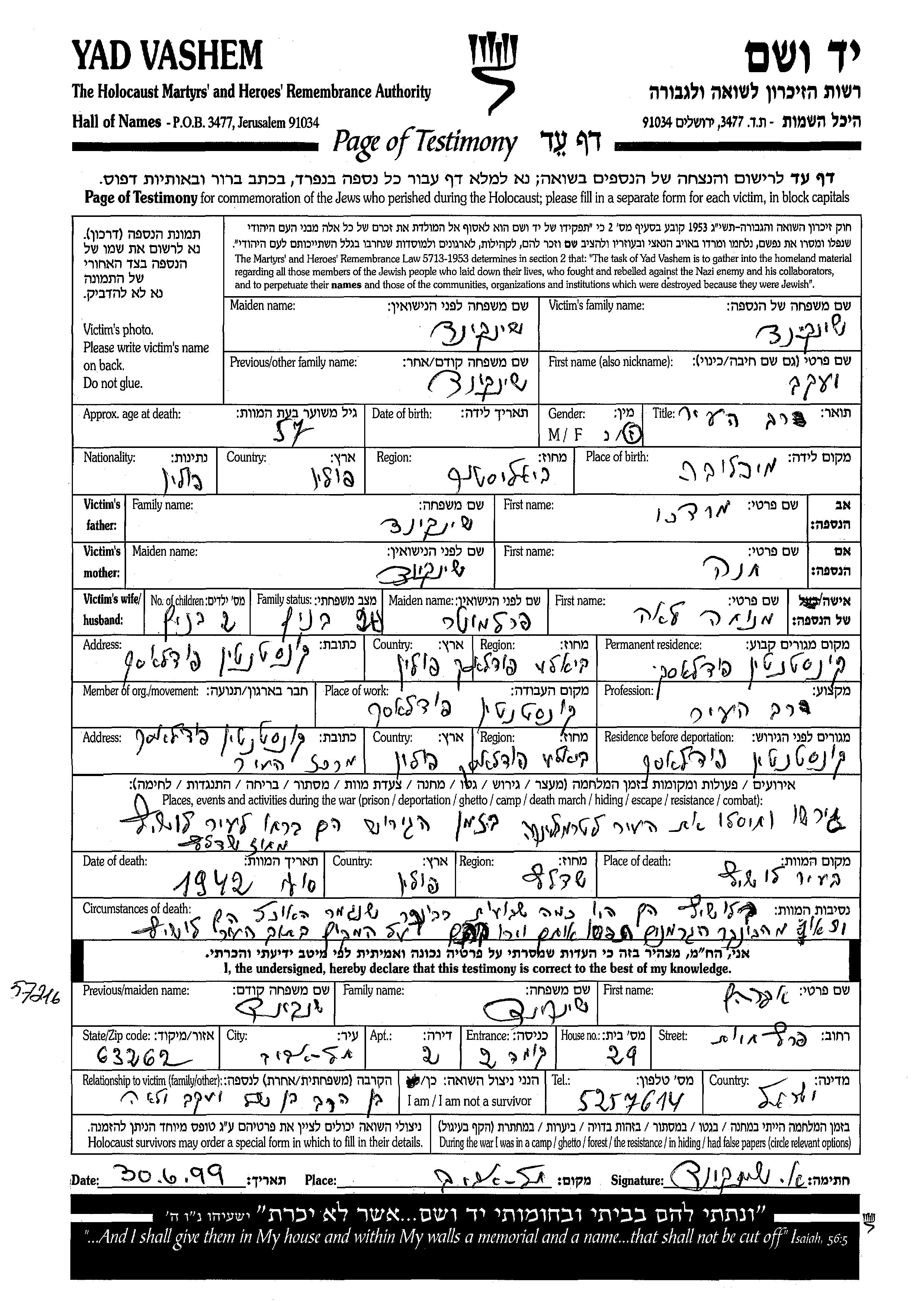 Scheinkind Yaakov Konstantyn, Pologne Feuille de témoignage