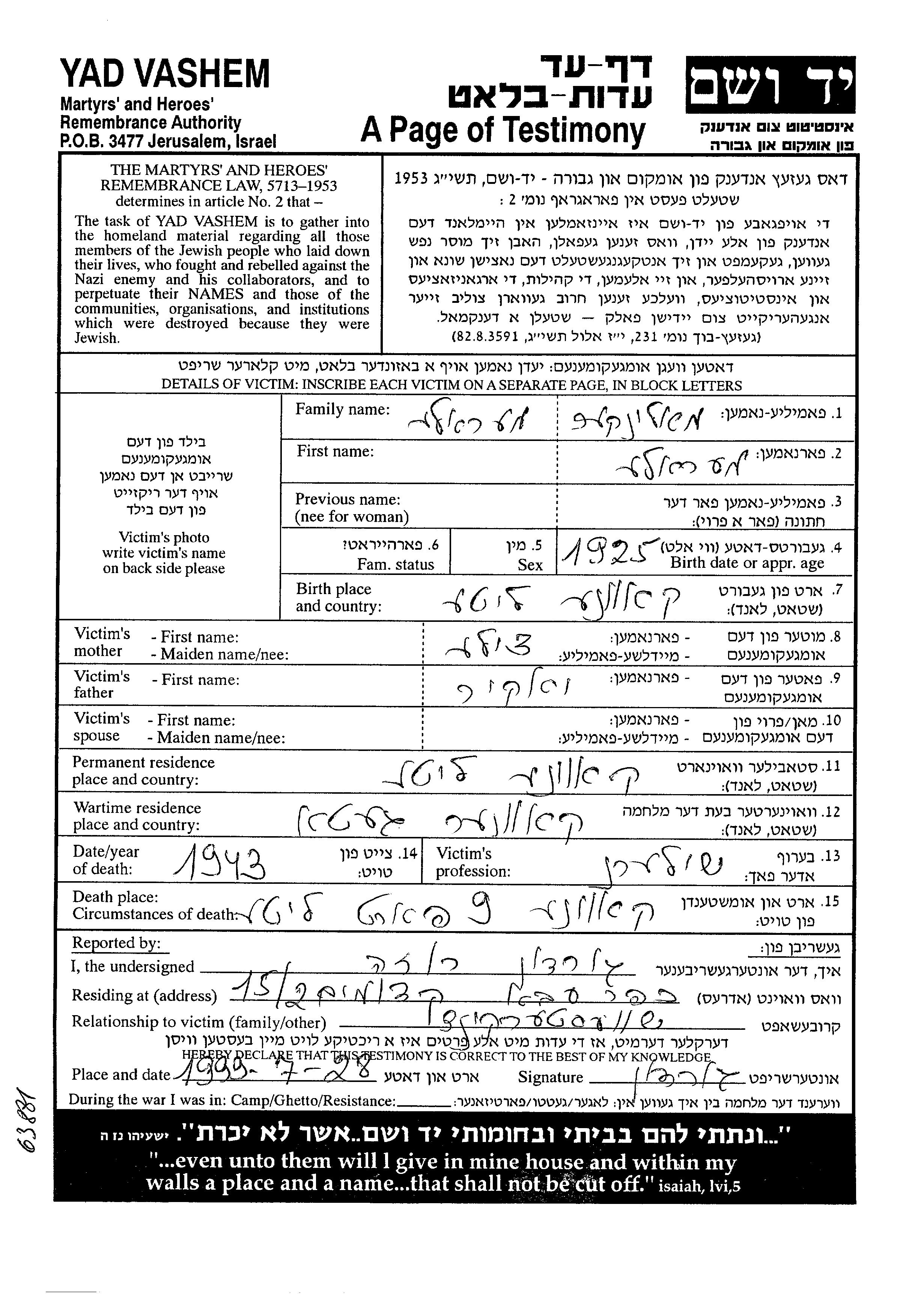 Yad Vashem - Pages of Testimony Names Memorial Collection
