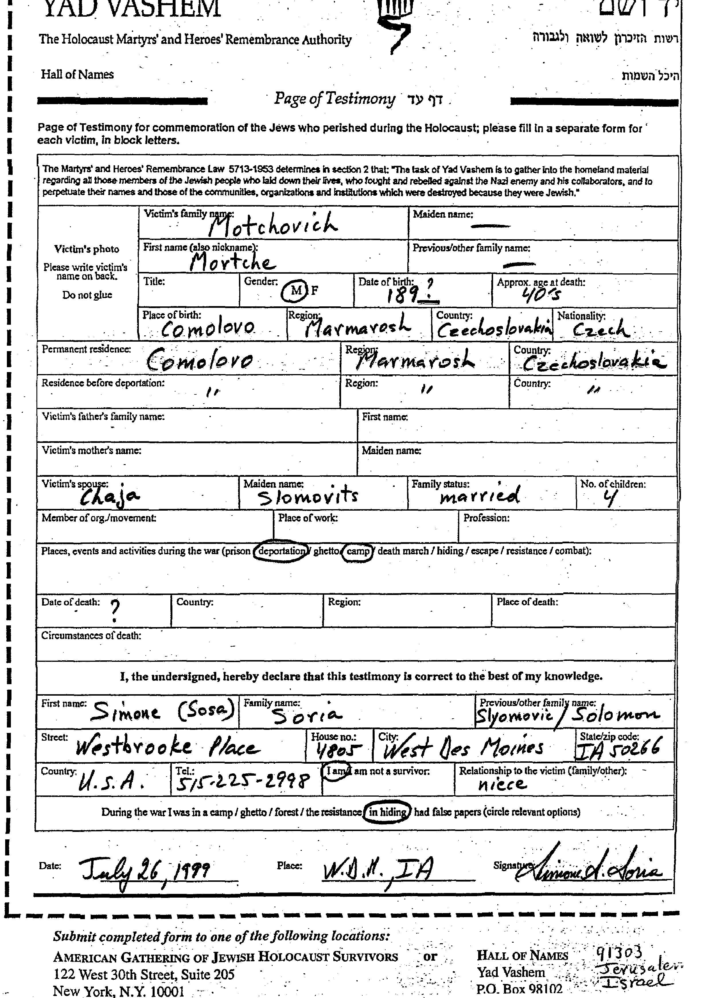 Mortche Motchovich est né à Comalovo, Tchécoslovaquie. Il était Mariée à Chaja née Slomovits. Avant la seconde guerre mondiale il vivait à Lachowicze, Pologne. Au cours de la guerre, il était à Lachowicze, Pologne.