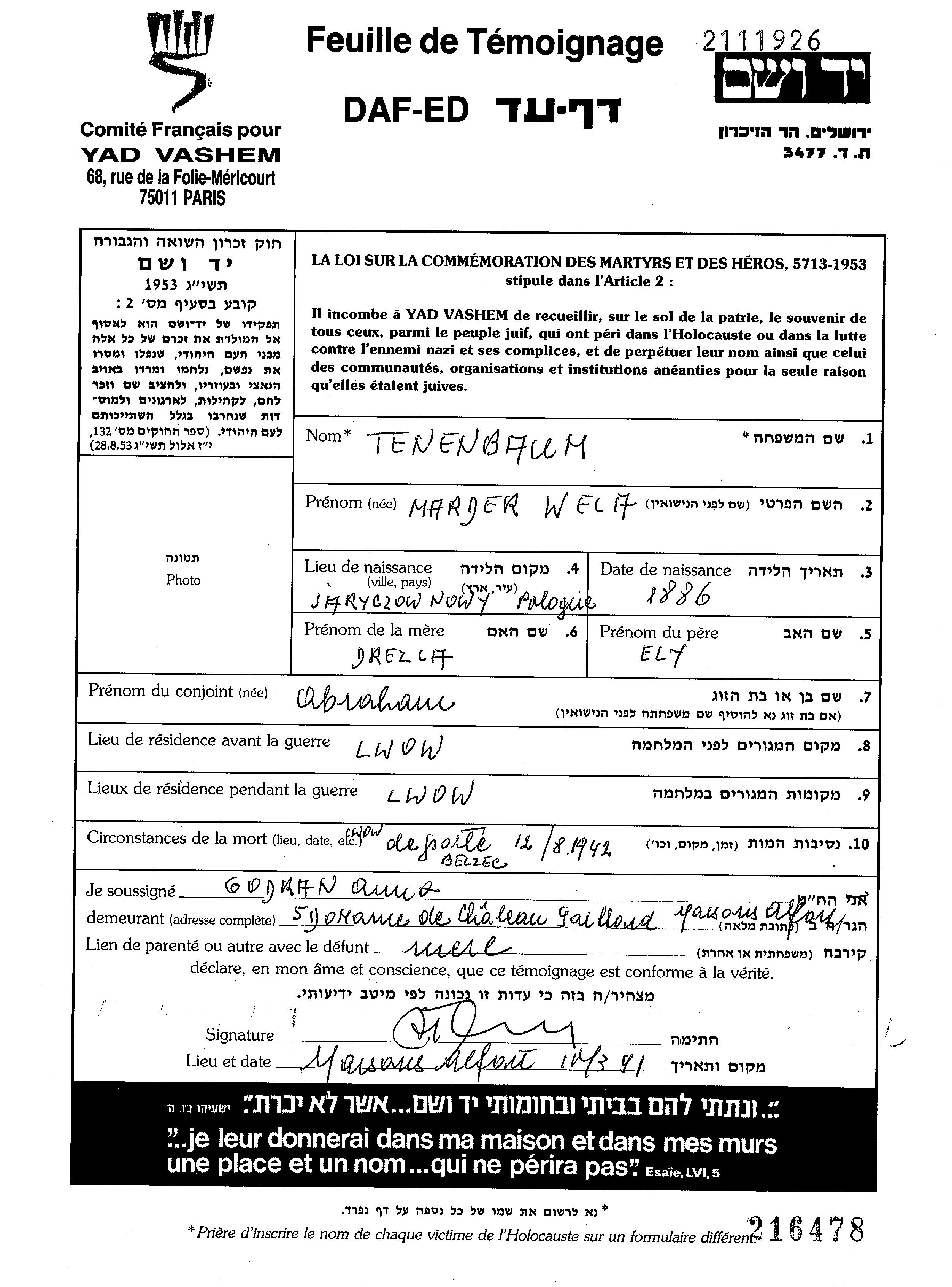 Tenenbaum Wela Vala 1886 Lwow, Pologne Feuille de témoignage