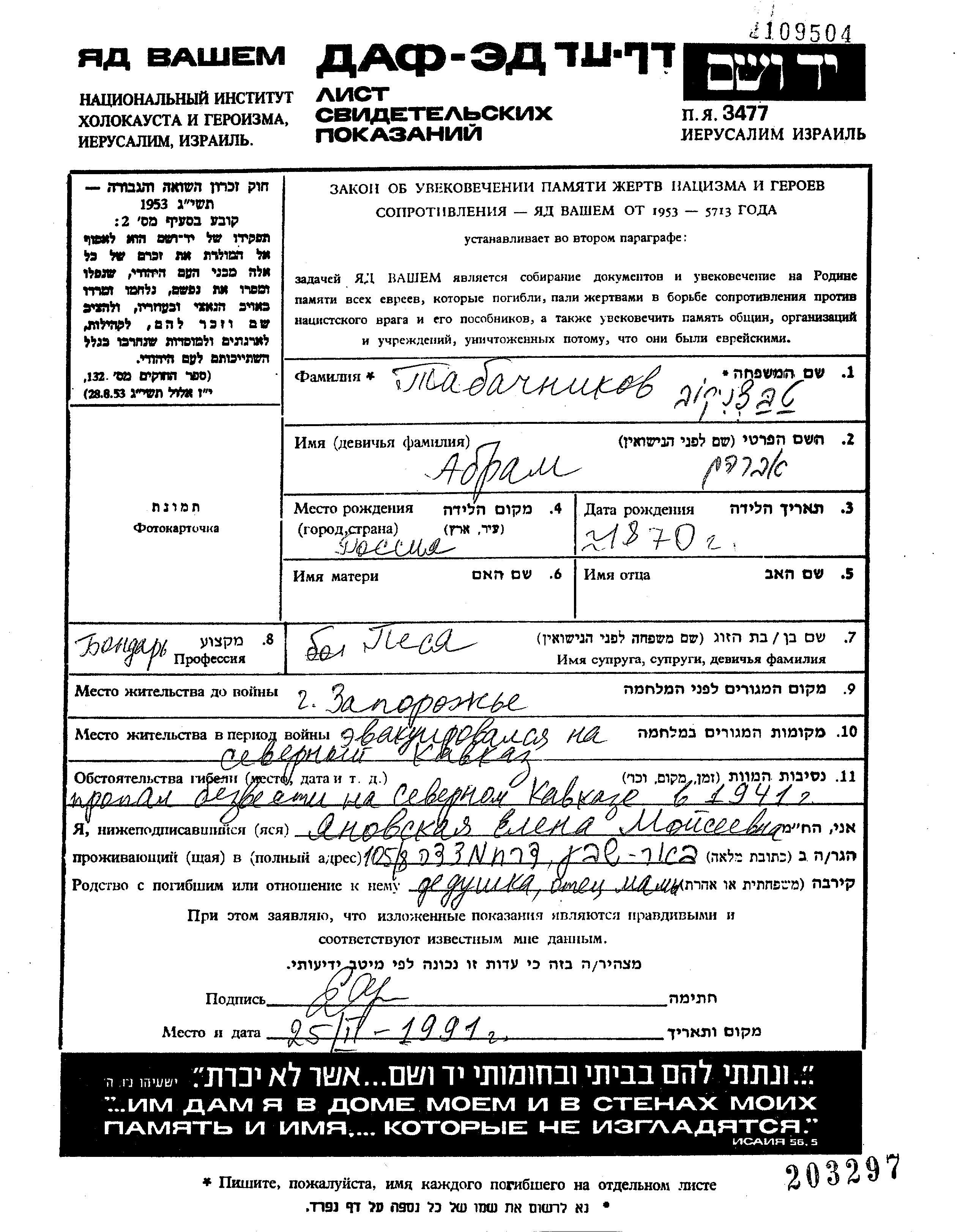 Tabachnikov Abram 1870 Zaporozhye, Ukraine (URSS) Feuille de témoignage
