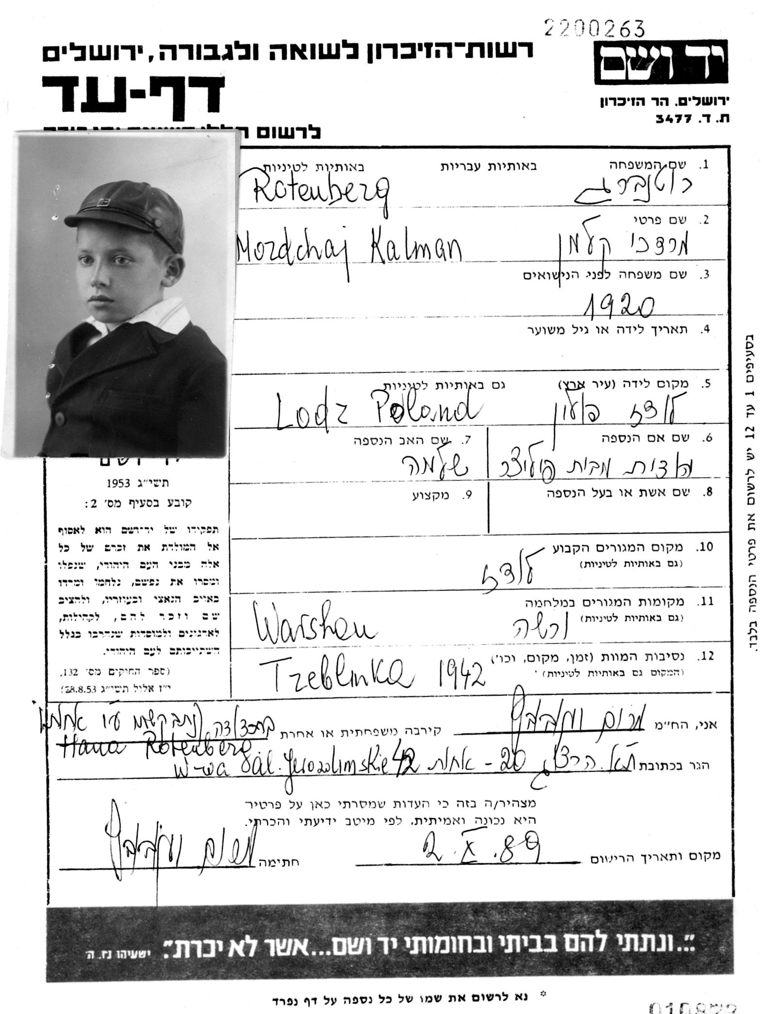 Mordchaj Kalman Rotenberg est né à Lodz, Pologne en 1920, fils de Shlomo et de Yehudit née Pilitzer. Avant la seconde guerre mondiale il vivait à Lodz, Pologne. Au cours de la guerre, il était à Warszawa, Pologne.