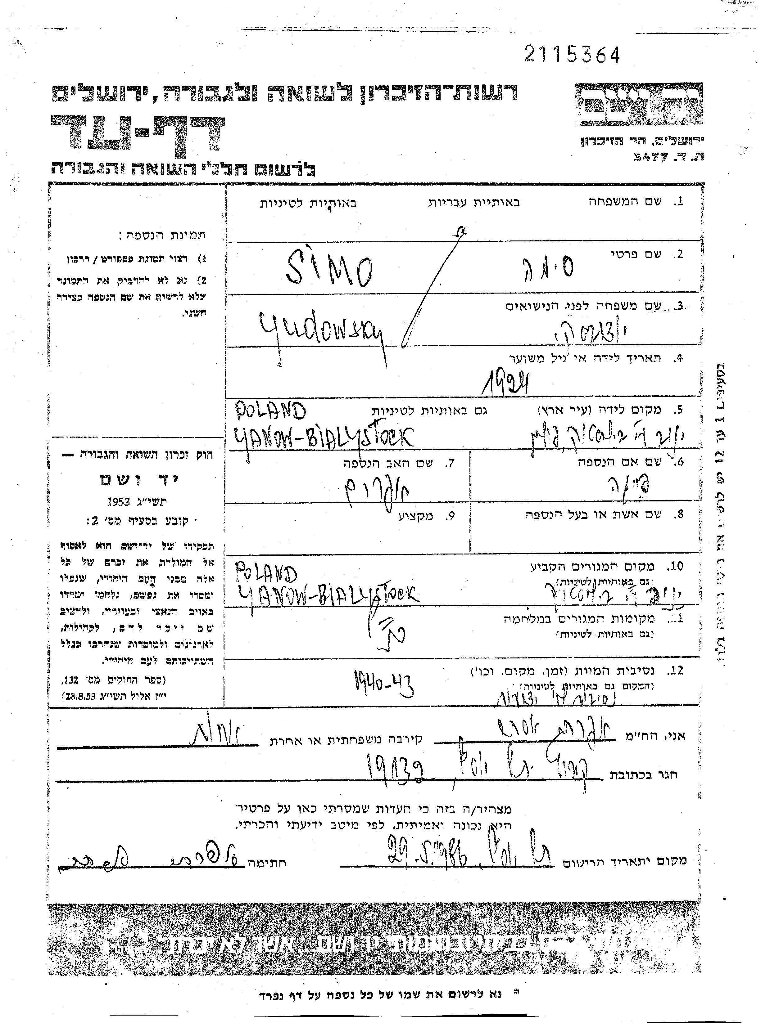 Simo Yudowsky est née à Janow Sokolski, Pologne, fille de Efraim et de Feiga née Bachrach. Avant la seconde guerre mondiale elle vivait à Janow Sokolski, Pologne. Pendant la guerre, elle était à Janow Sokolski, Pologne.