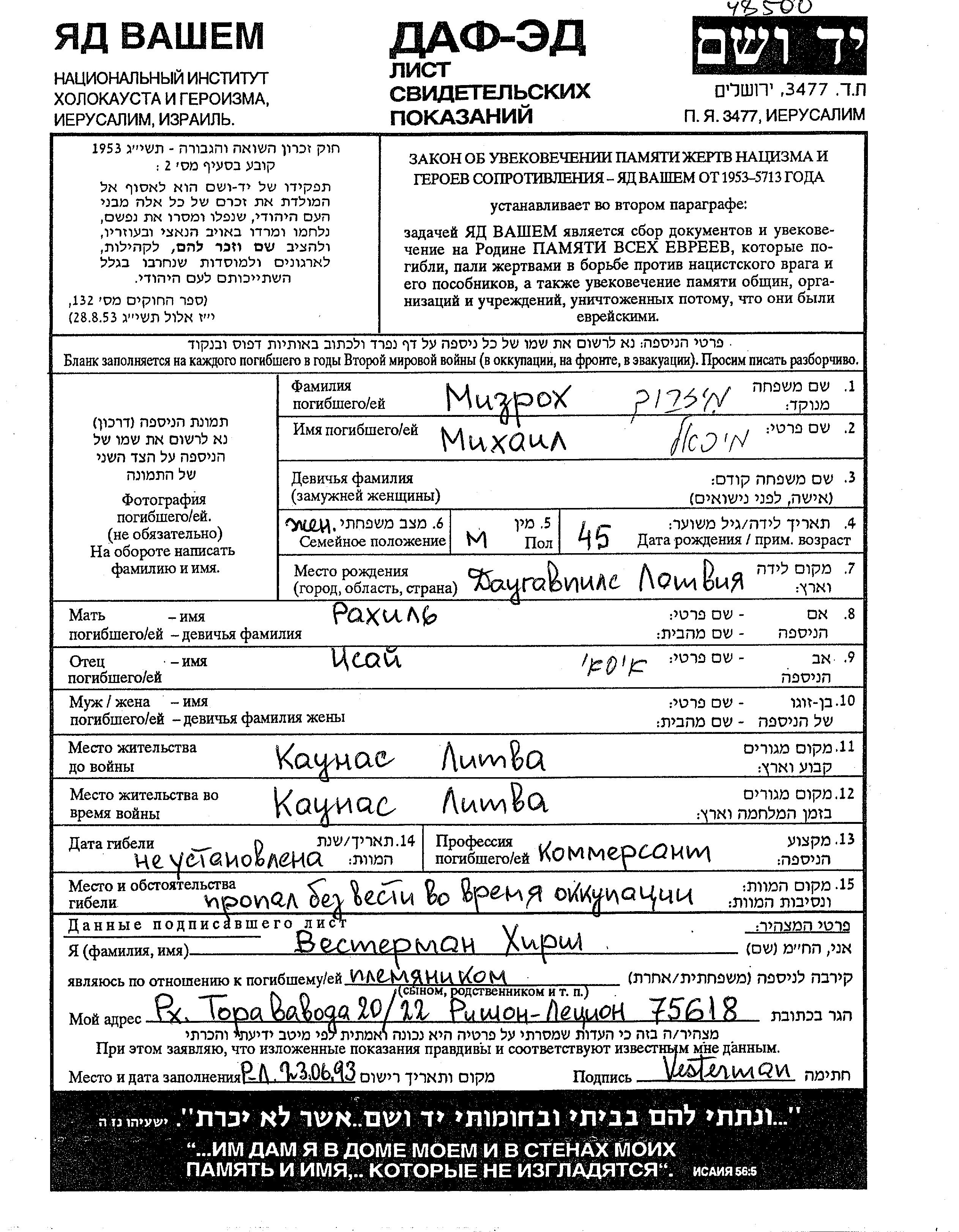Mizrakh Mikhail Kaunas, Lituanie Feuille de témoignage