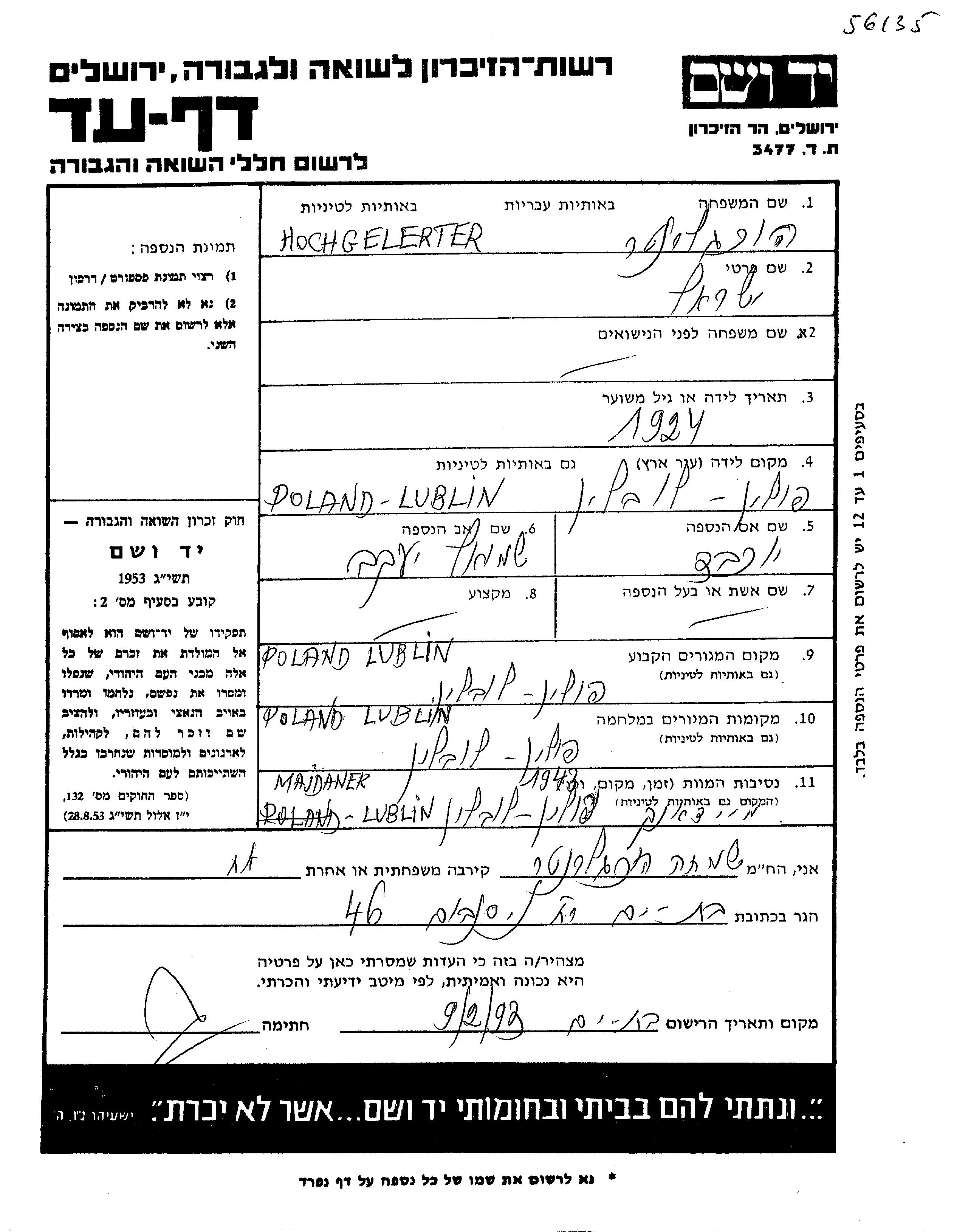 Hochgelernter Israel 1924 Lublin, Pologne Feuille de témoignage