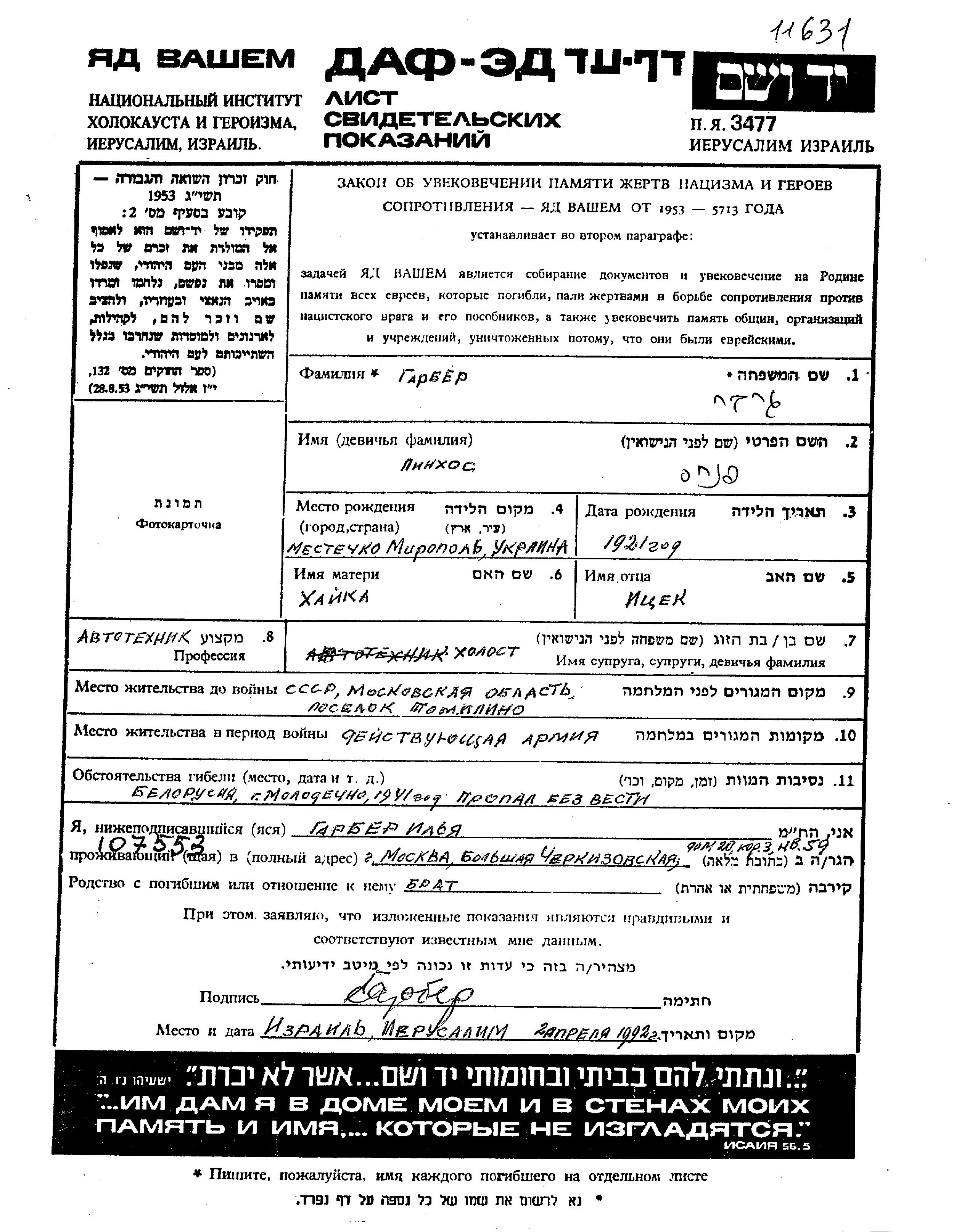 Garbar Graber Pinkhos 1921 Tomilino, Ukraine (URSS) Feuille de témoignage