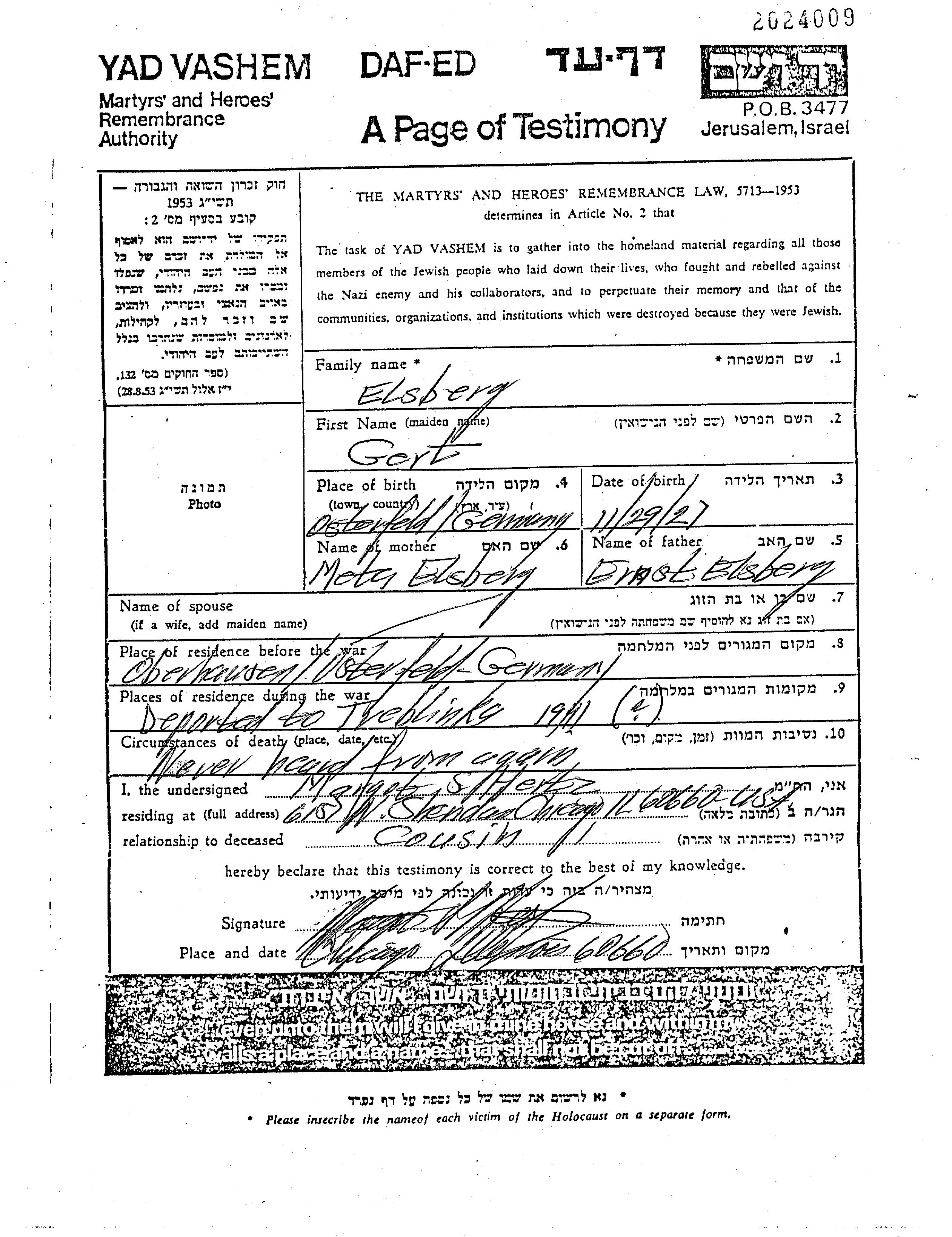 Gert Elsberg est né à Osterfeld, Allemagne en 1927, fils de Ernst et de Meta Mate née Juelich Ilikh. Il était Enfant. Avant la seconde guerre mondiale il vivait à Osterfeld, Allemagne. Au cours de la guerre, il était à Treblinka, Pologne.