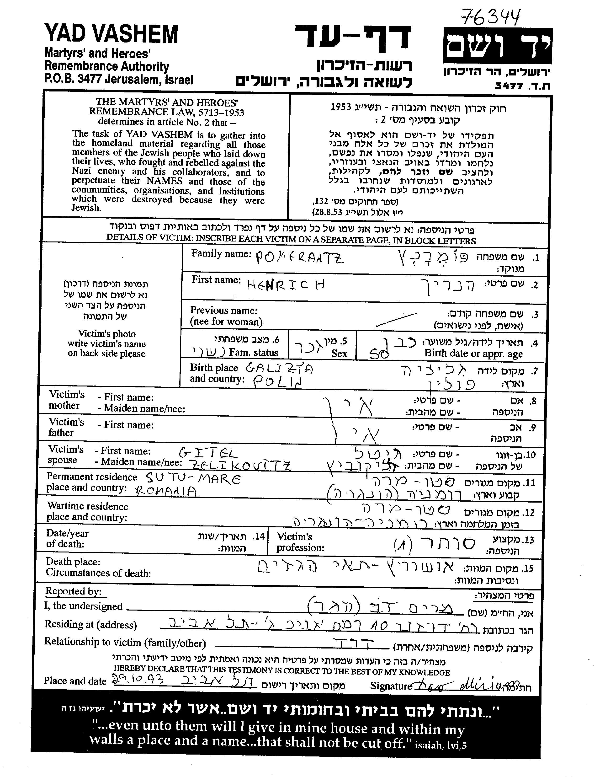 Pomerantz Henrich Satu Mare, Roumanie Feuille de témoignage