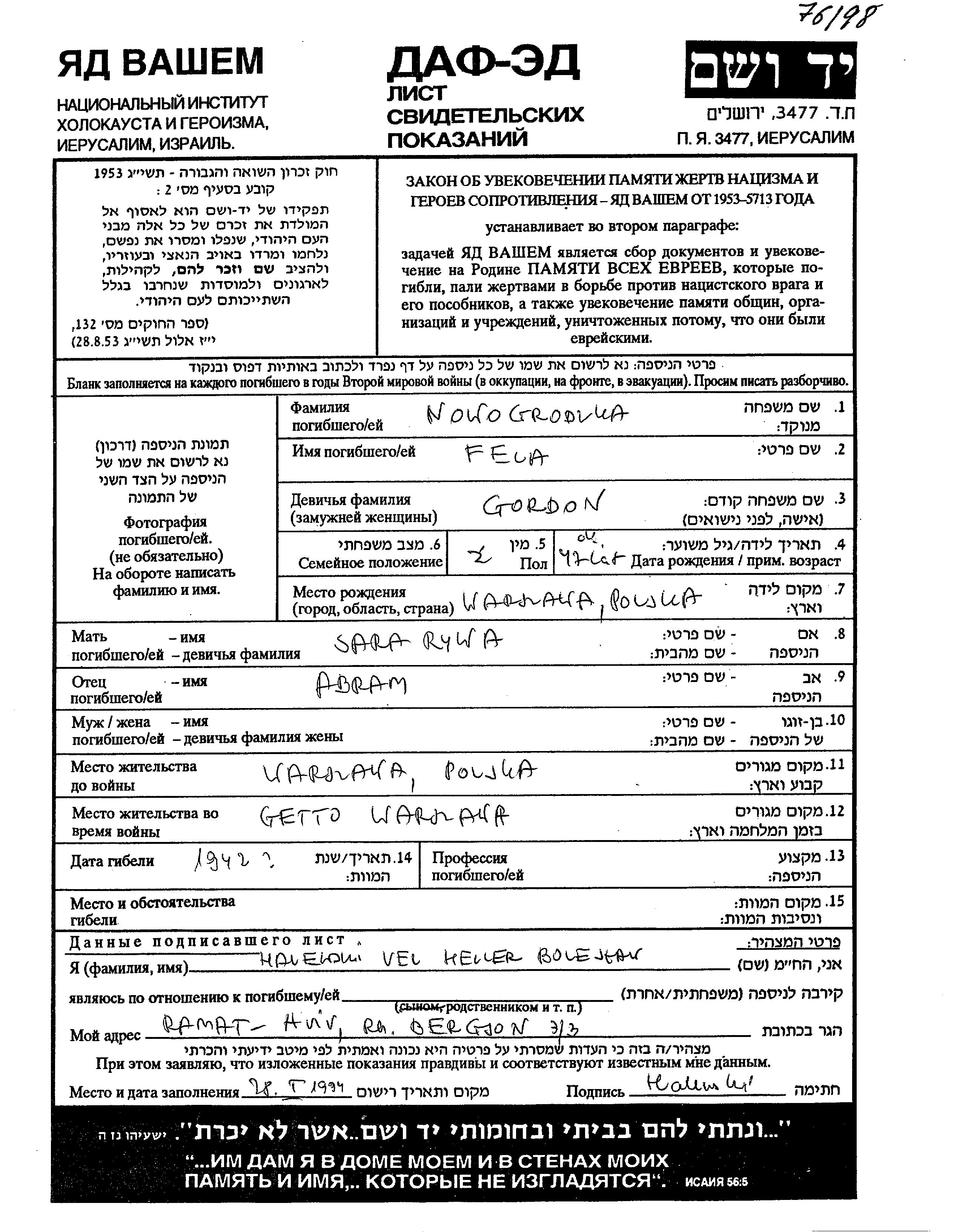 Yad Vashem - Pages of Testimony Names Memorial Collection