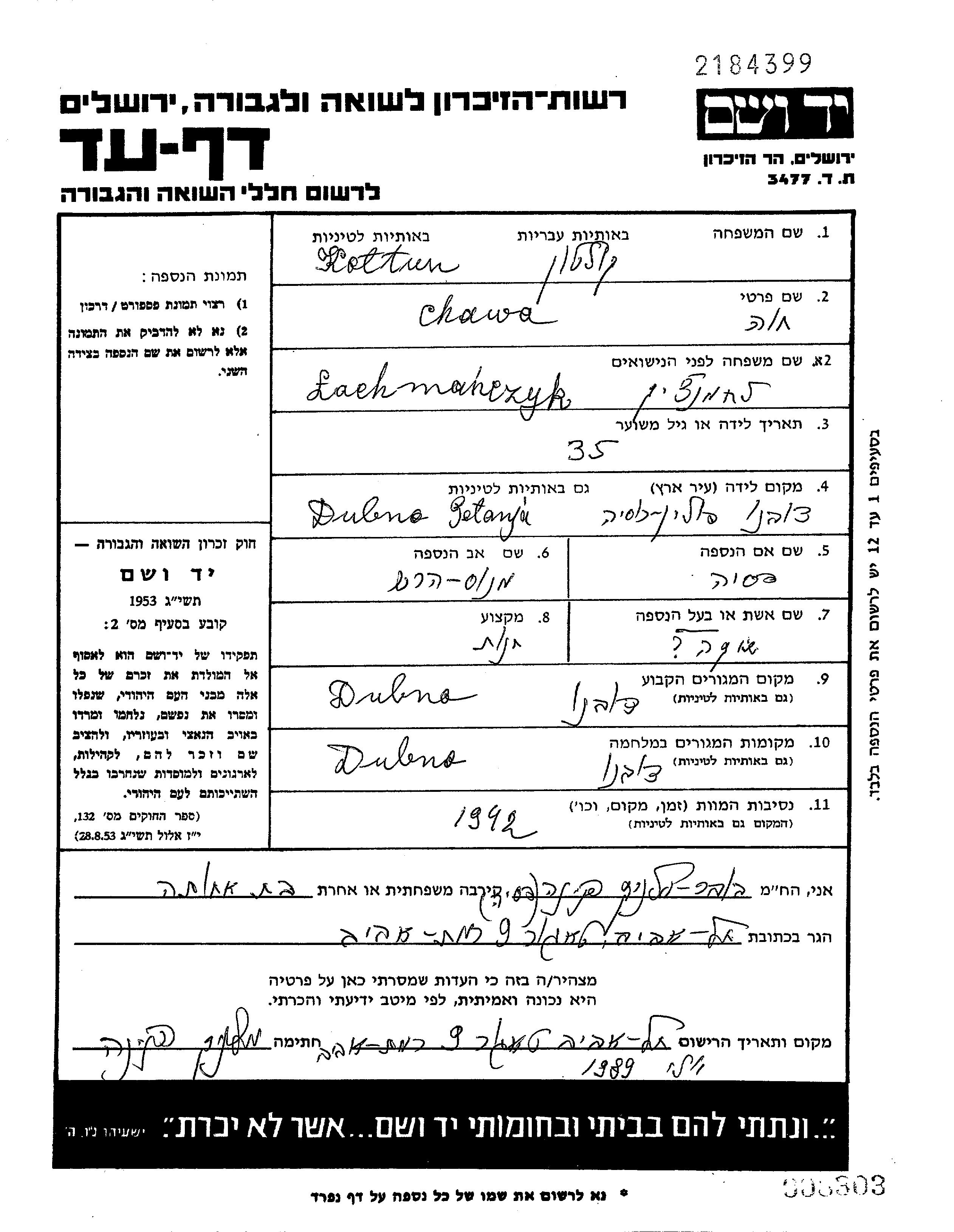 Koltun Chawa 1907 Dubno, Pologne Feuille de témoignage