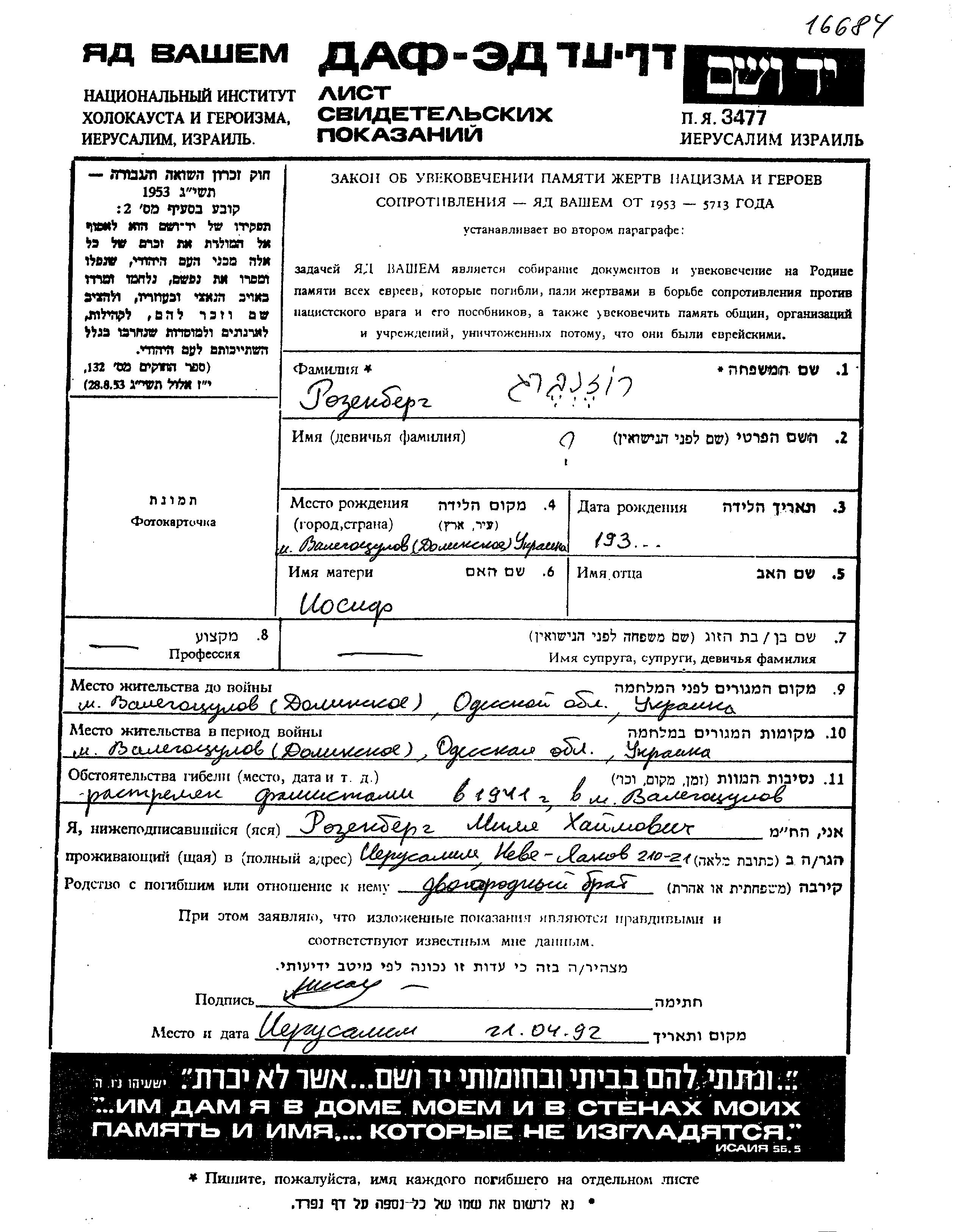 Rozenberg prénom inconnu Valegotsulovo, Ukraine (URSS) Feuille de témoignage