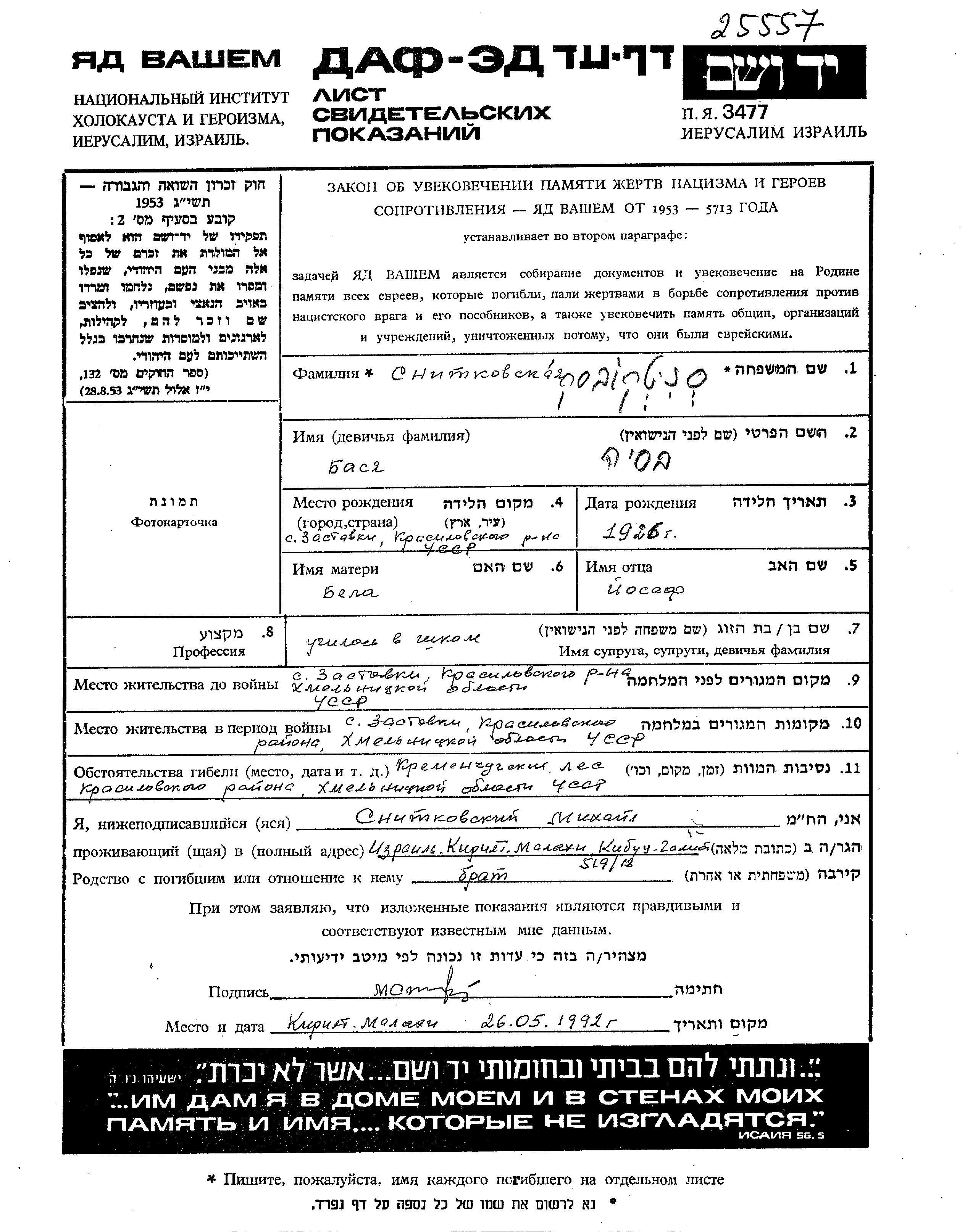 Basia Snitkovski est née à Zastavki, Ukraine (URSS) en 1926, fille de Yosef et de Bela. Elle était Élève et Enfant. Avant la seconde guerre mondiale elle vivait à Zastavki, Ukraine (URSS). Pendant la guerre, elle était à Zastavki, Ukraine (URSS). Basia a été assassinée pendant la Shoah. Lieu de la mort: Kamenets Podolskiy, Ukraine (URSS).
