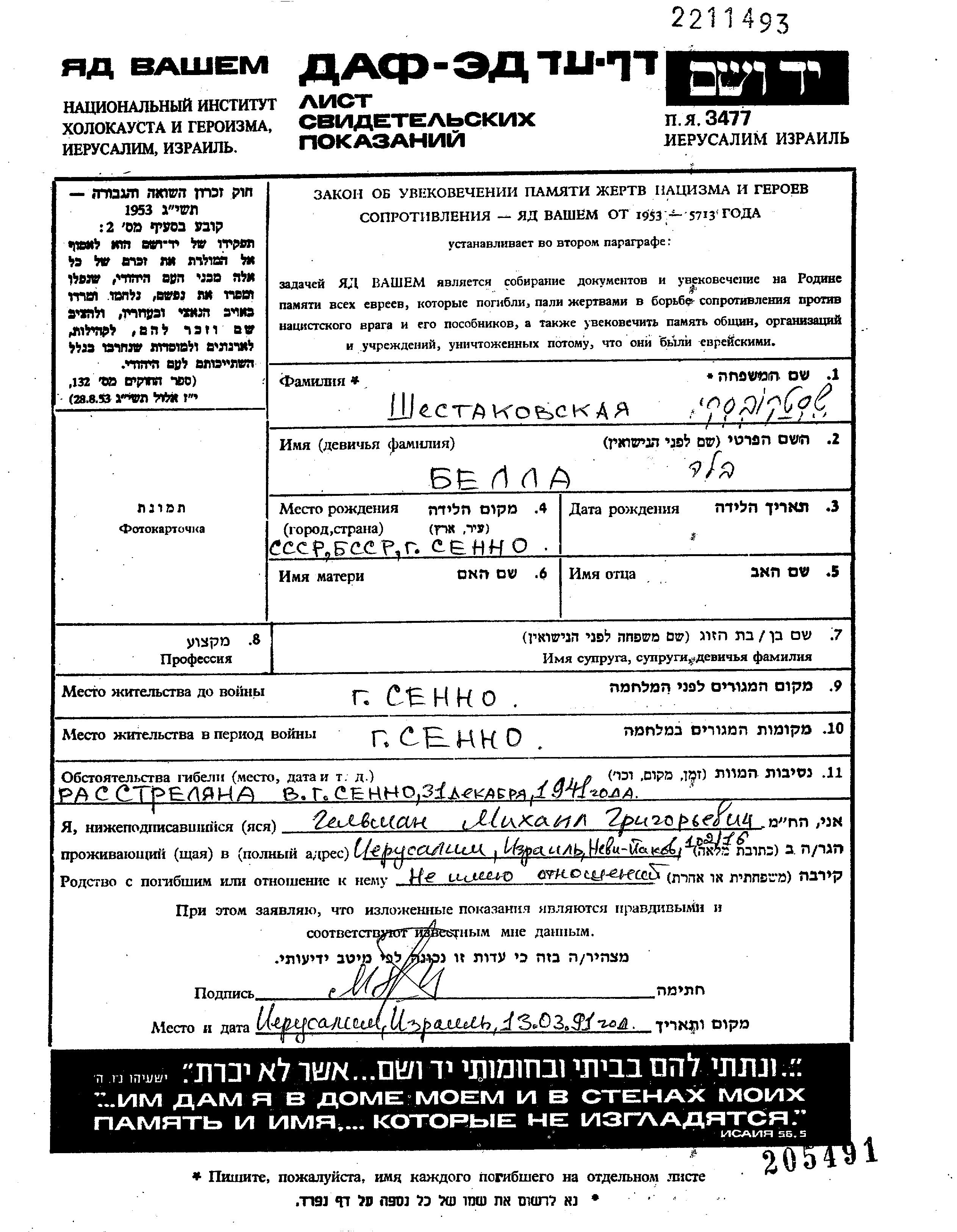 Shestakovski Bella Senno, Bélorussie (URSS) Feuille de témoignage