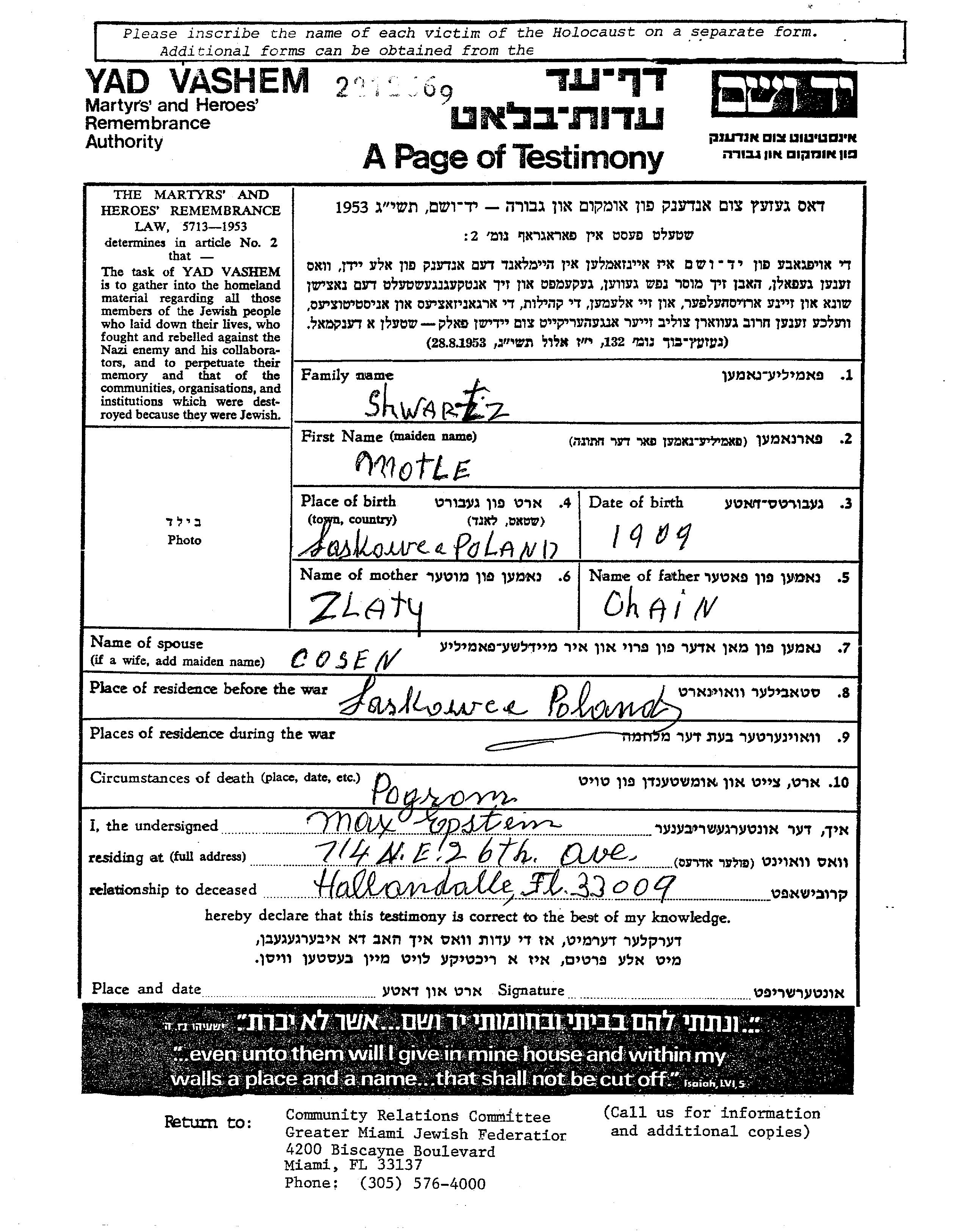 Motle Shwartz est né à Laskowce, Pologne en 1909, fils de Chaim et de Zlaty. Avant la seconde guerre mondiale il vivait à Laskowce, Pologne. Au cours de la guerre, il était à Pologne.
