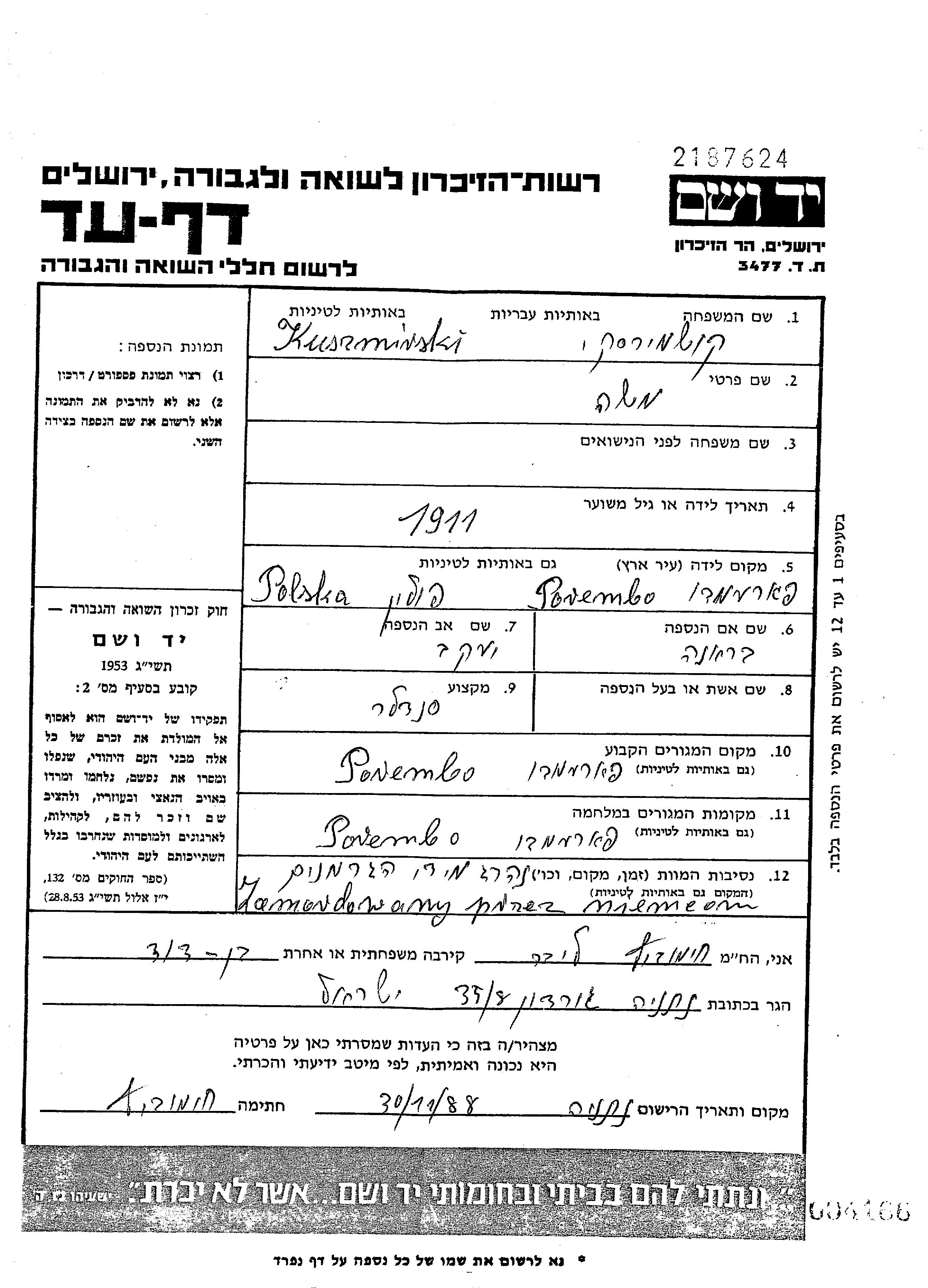 Kuszmirski Moshe 1911 Poreba, Pologne Feuille de témoignage