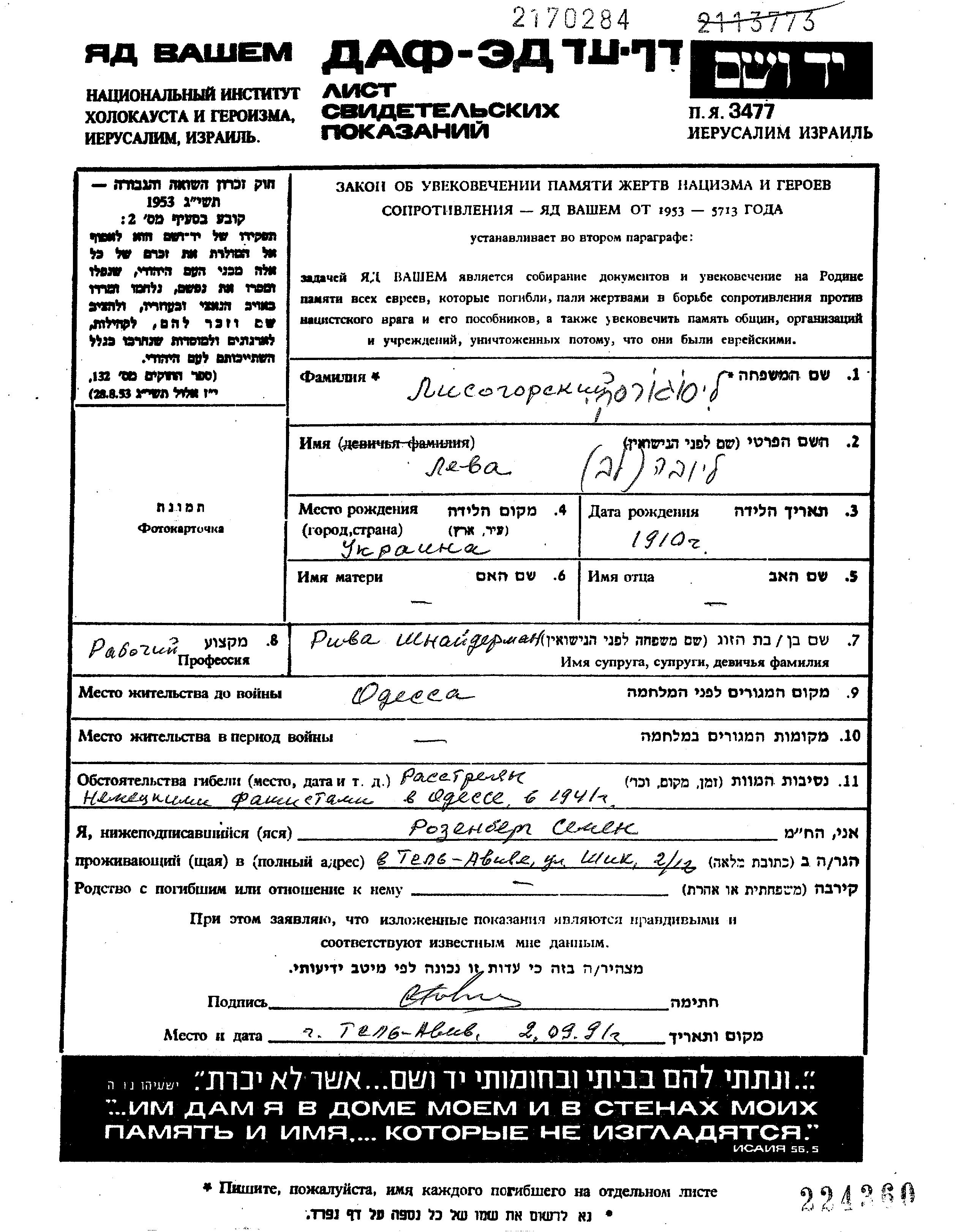 Lisogorski Lyova Liuba 1910 Odessa, Ukraine (URSS) Feuille de témoignage