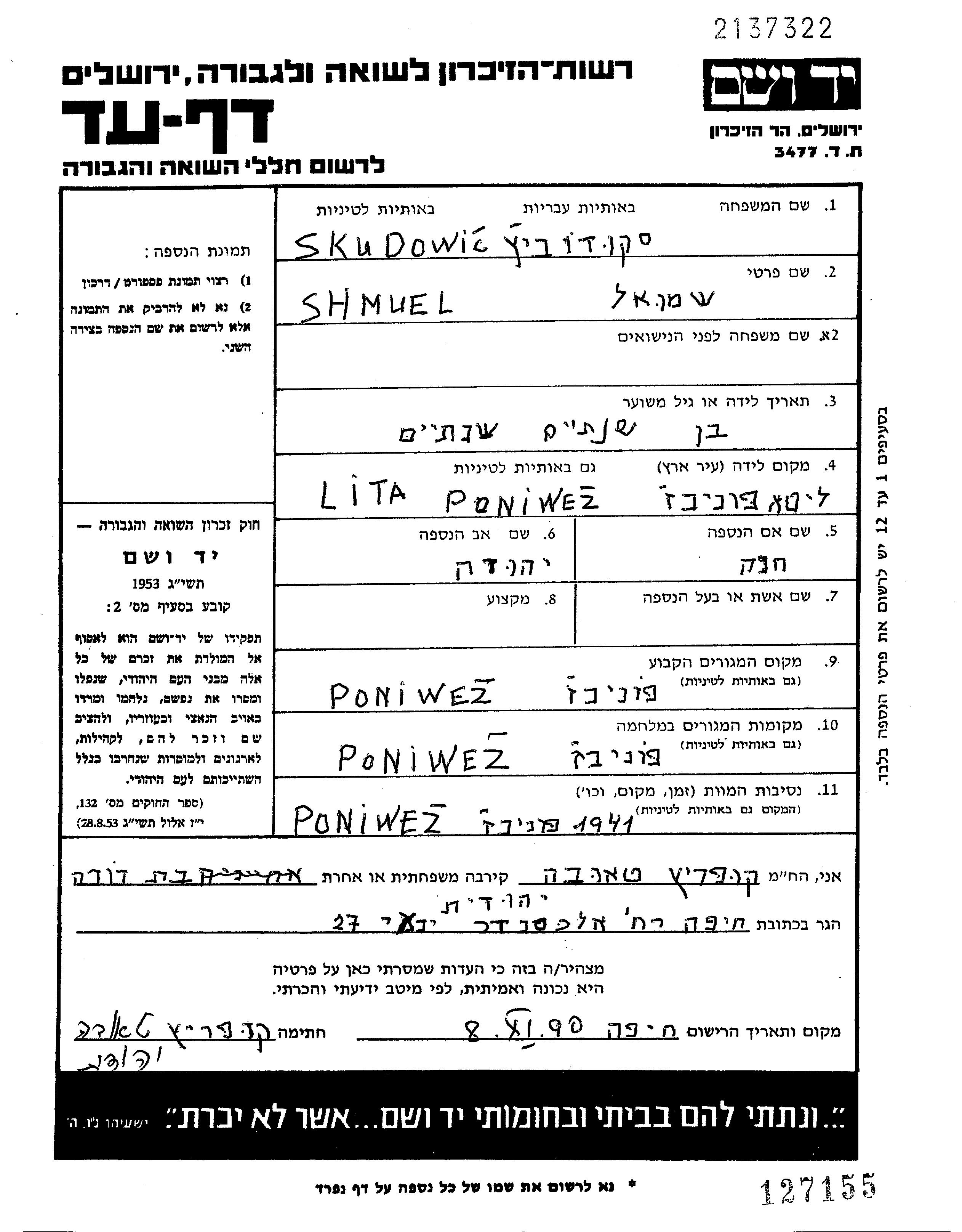 Skudowic Shmuel Ponivez, Lituanie Feuille de témoignage