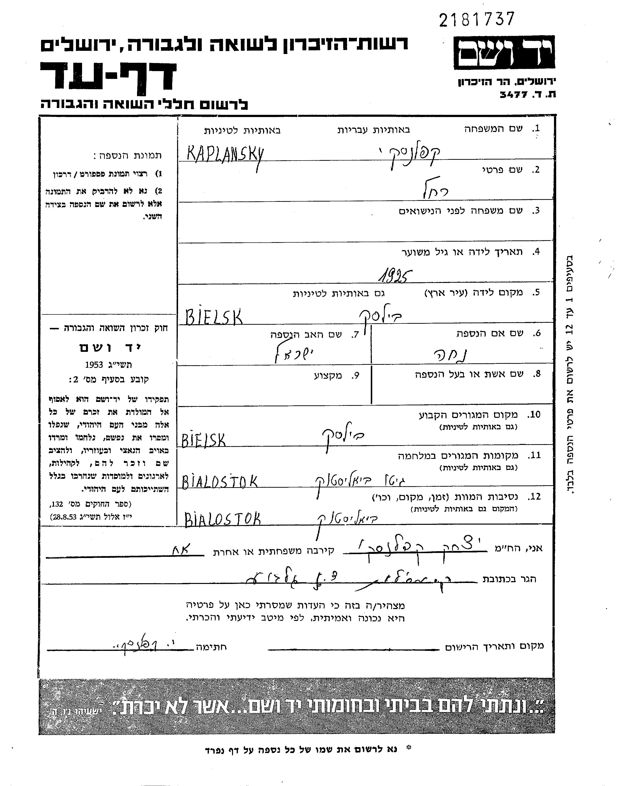 Kaplanski Rakhel 1925 Bielsk, Pologne Feuille de témoignage