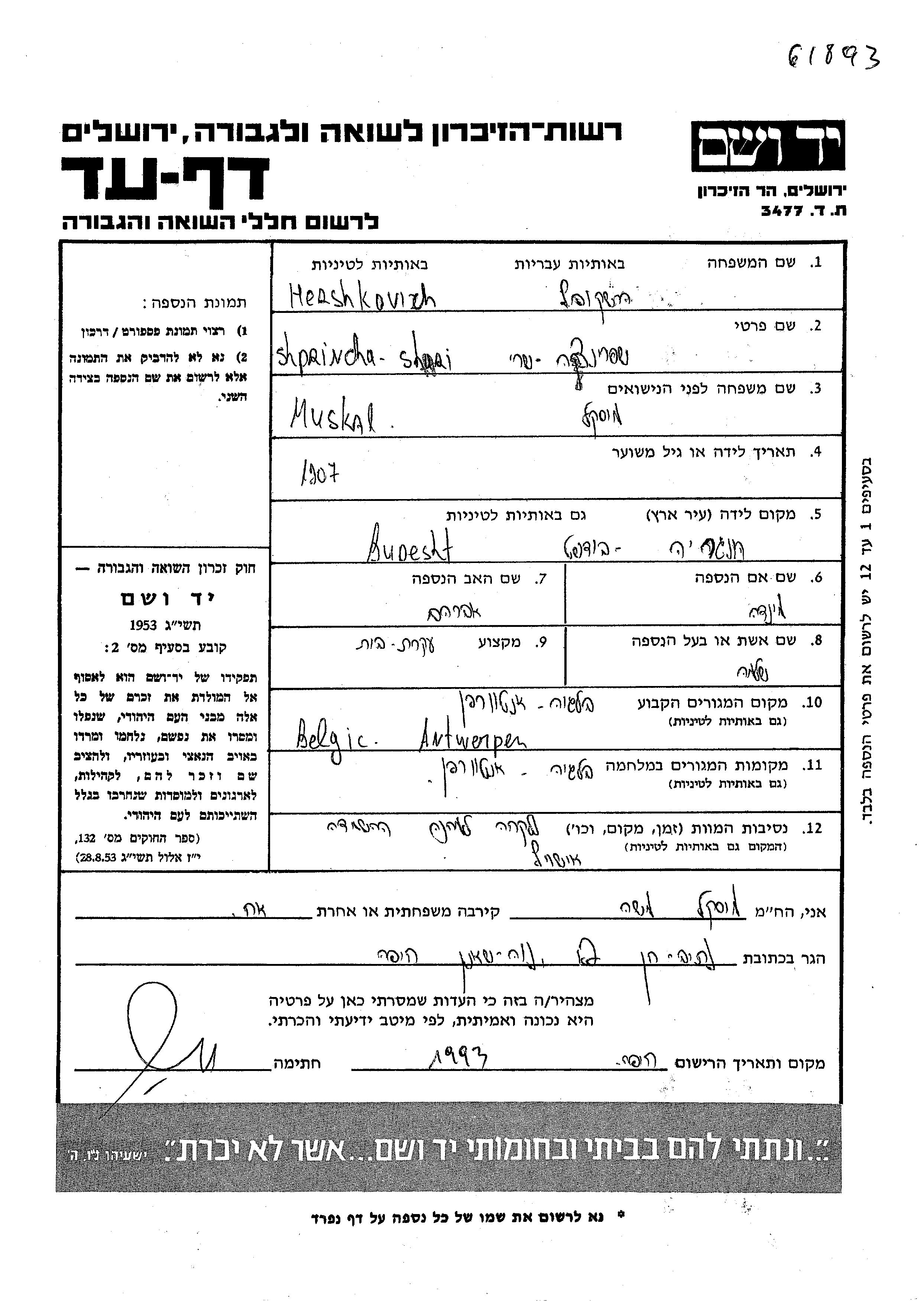Hershkovich Schprincha Sari 1907 Antwerpen, Belgique Feuille de témoignage