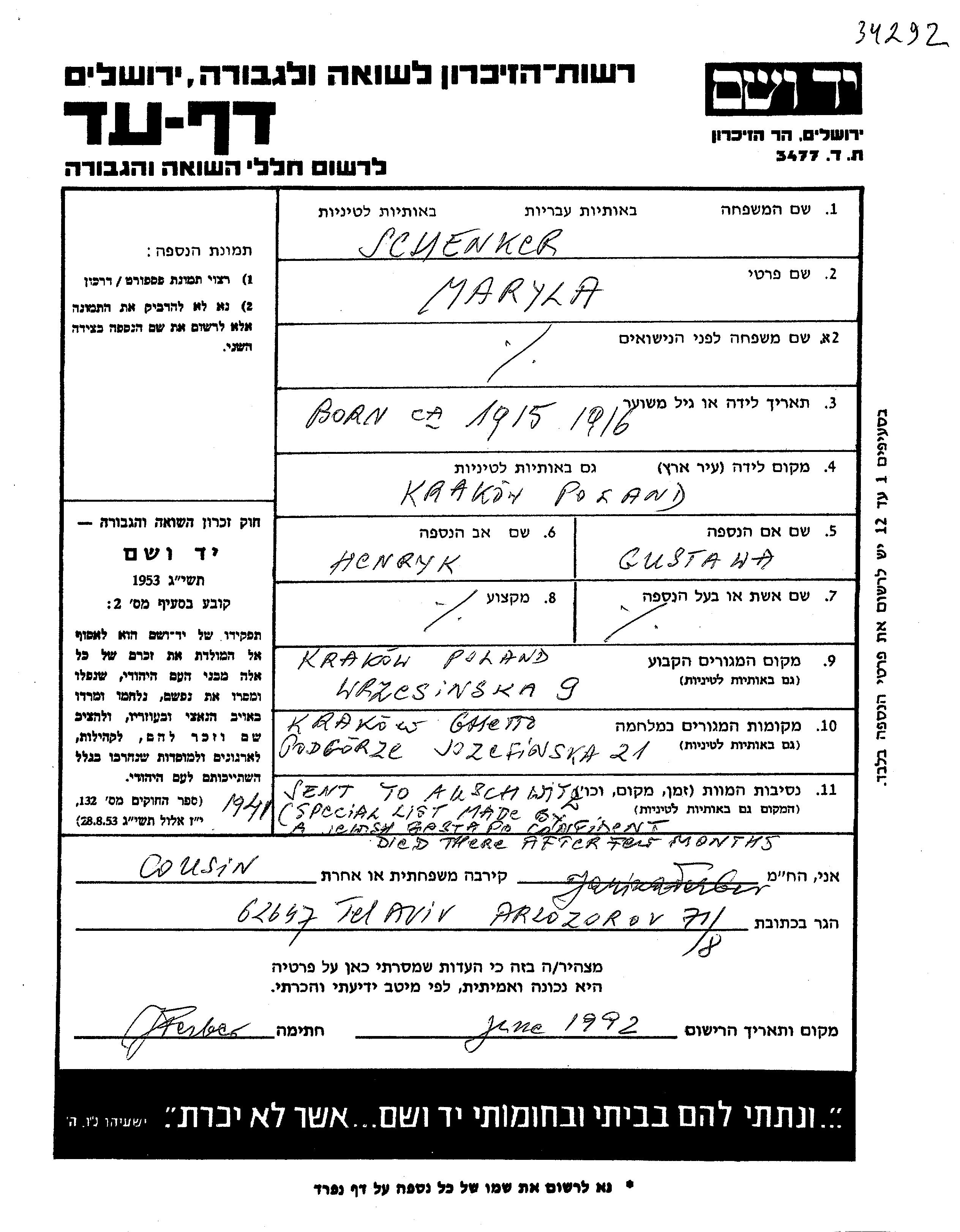 Schenker Maryla 1916 Krakow, Pologne Feuille de témoignage