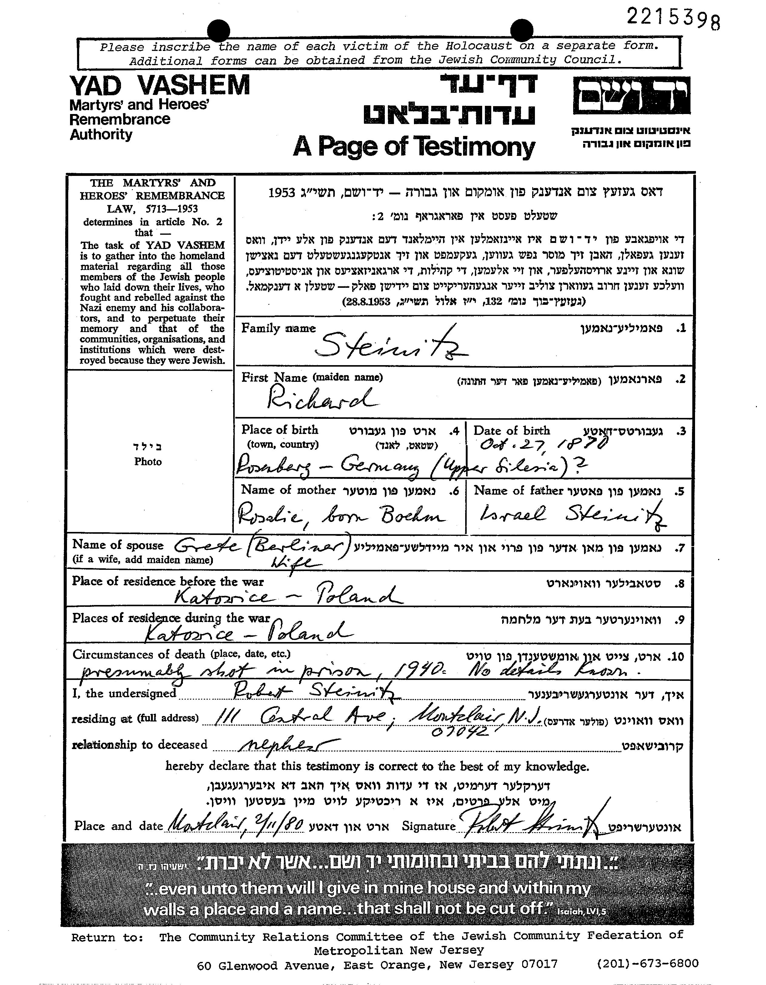 Richard Steinitz est né à Rosenberg, Allemagne en 1870, fils de Israel et de Rosalie née Boehm. Il était Mariée à Grete. Avant la seconde guerre mondiale il vivait à Katowice, Pologne. Au cours de la guerre, il était à Katowice, Pologne.