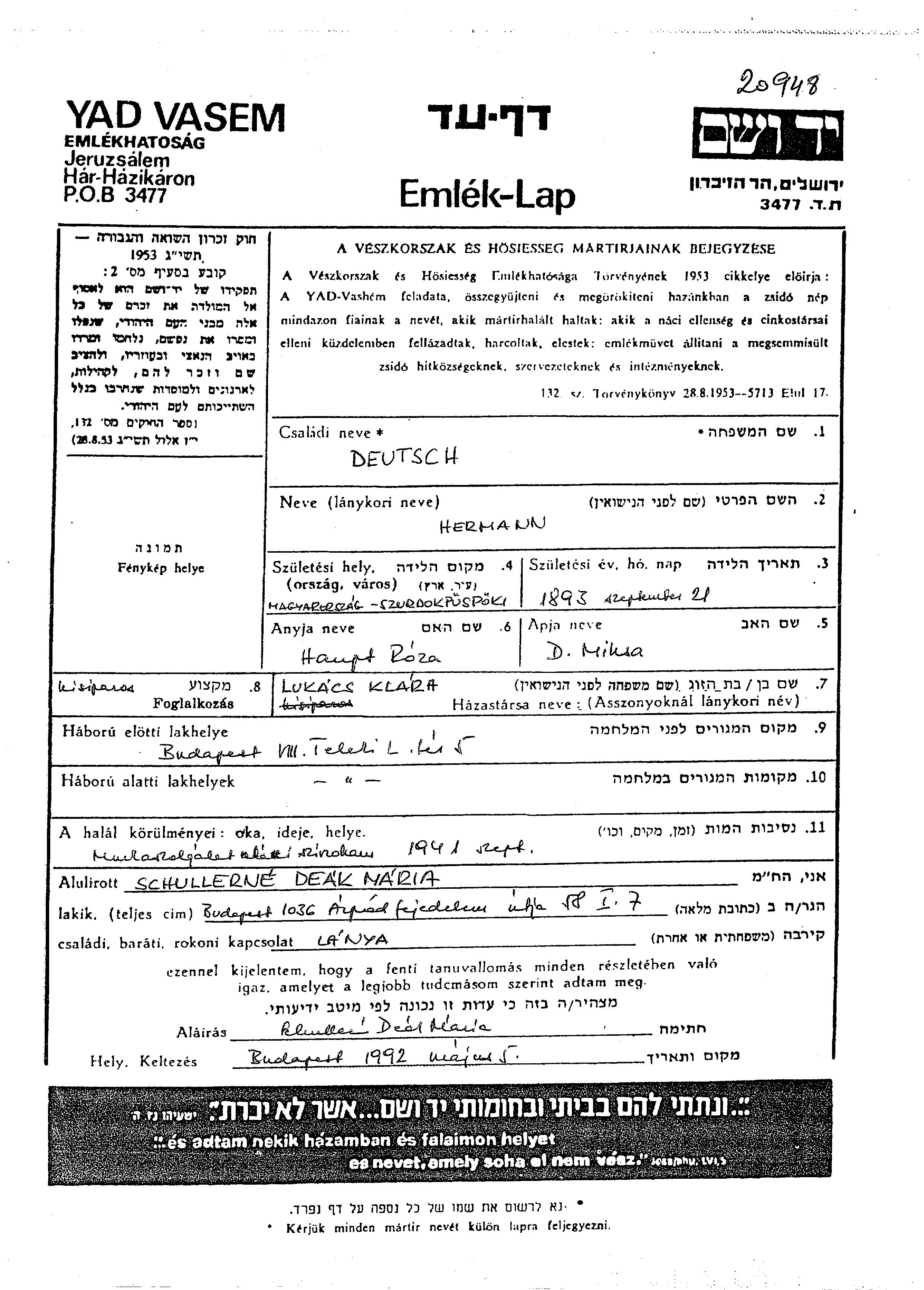 Deutsch Herman 1893 Budapest, Hongrie Feuille de témoignage