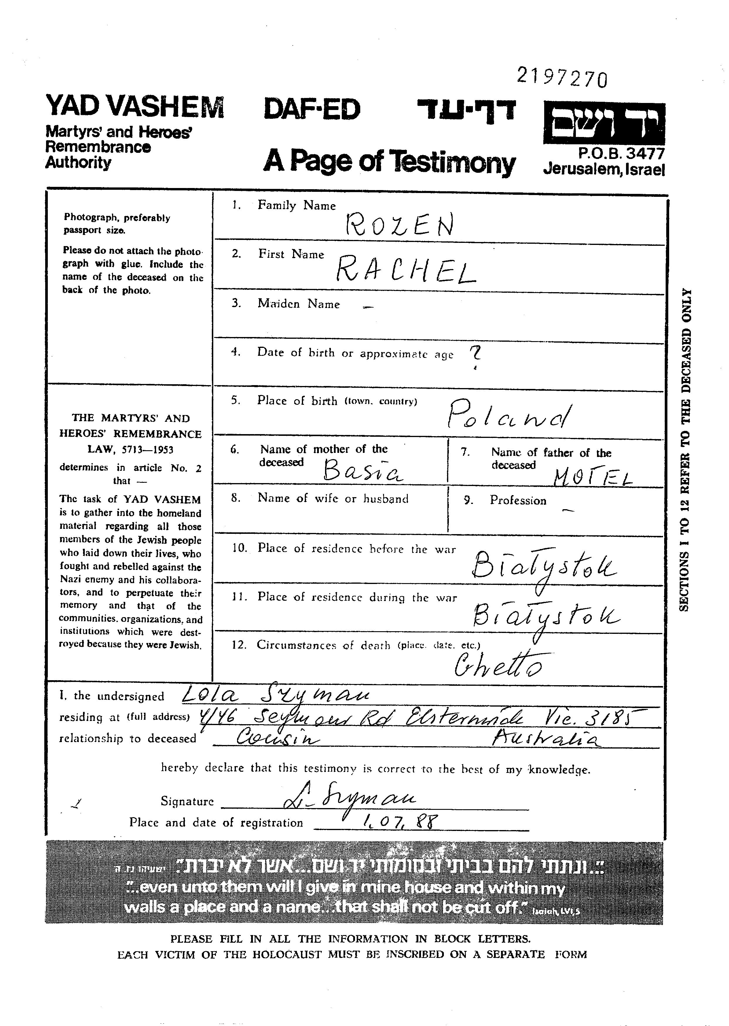 Rozen Rachel Bialystok, Pologne Feuille de témoignage