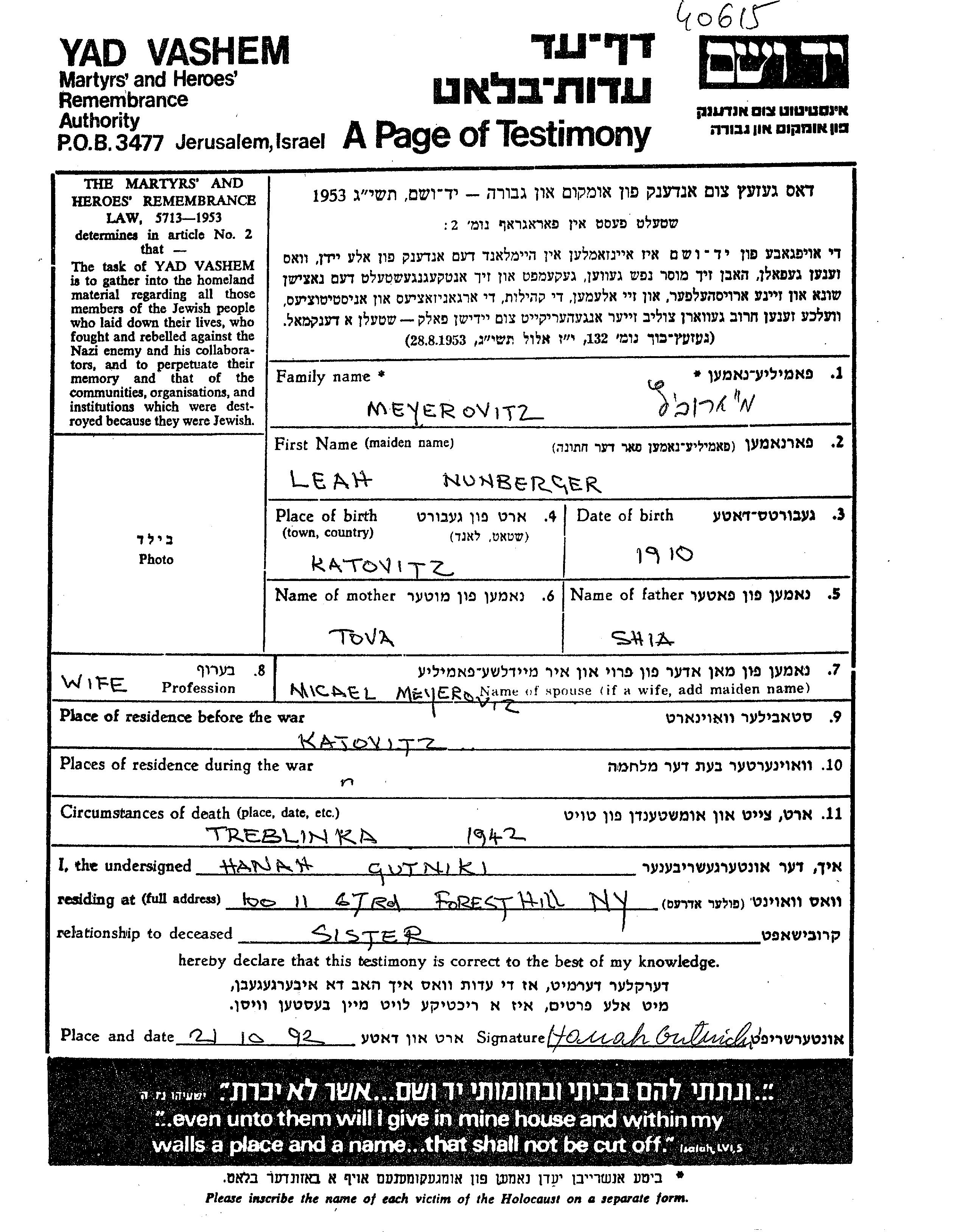 Meyerovitz Leah 1910 Katowice, Pologne Feuille de témoignage