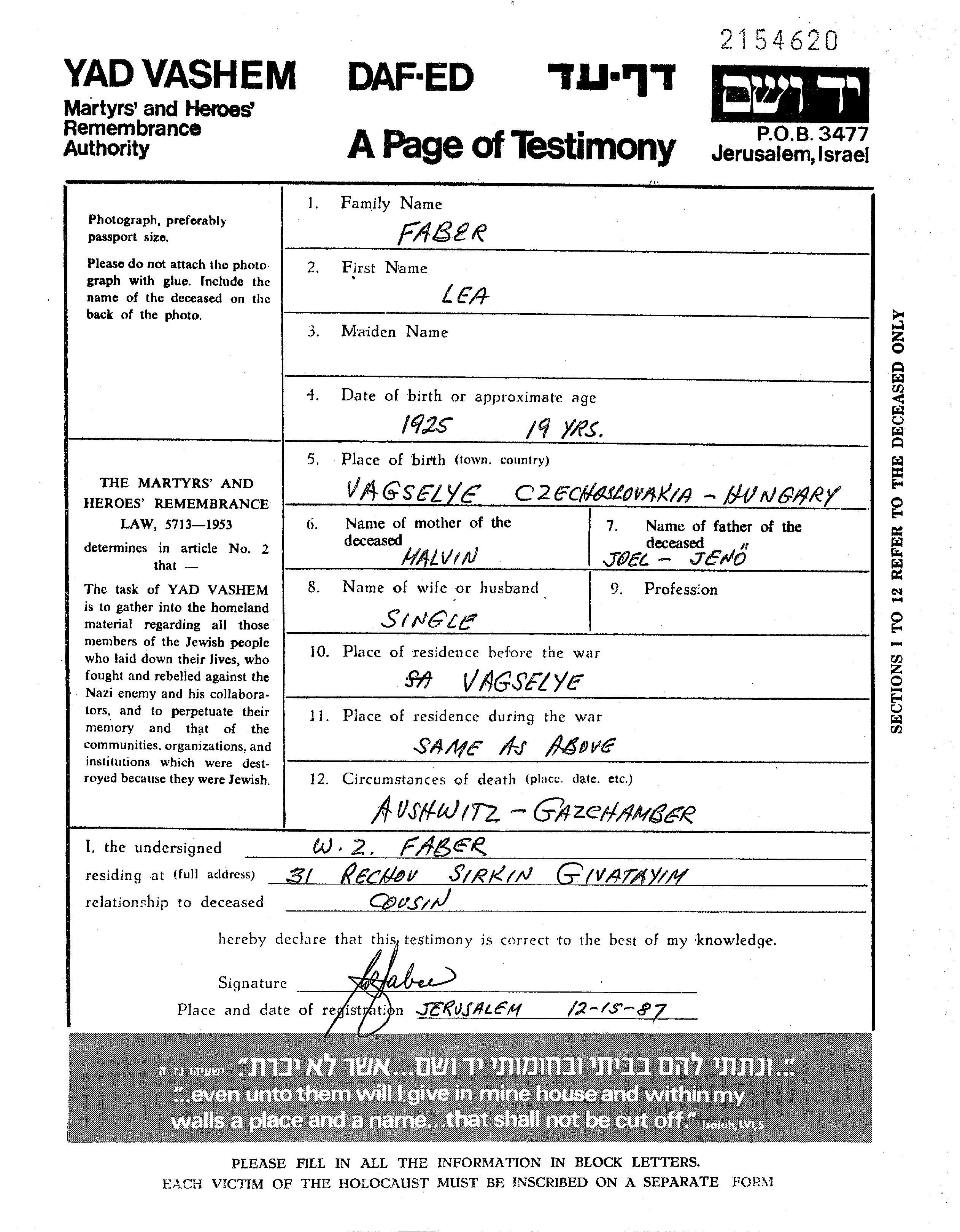 Lea Faber est née à Vagsellye, Tchécoslovaquie en 1925, fille de Jeno Joel et de Malvina Malvin née Reichenthal. Elle était Célibataire. Avant la seconde guerre mondiale elle vivait à Vagsellye, Tchécoslovaquie. Pendant la guerre, elle était à Vagsellye, Tchécoslovaquie.