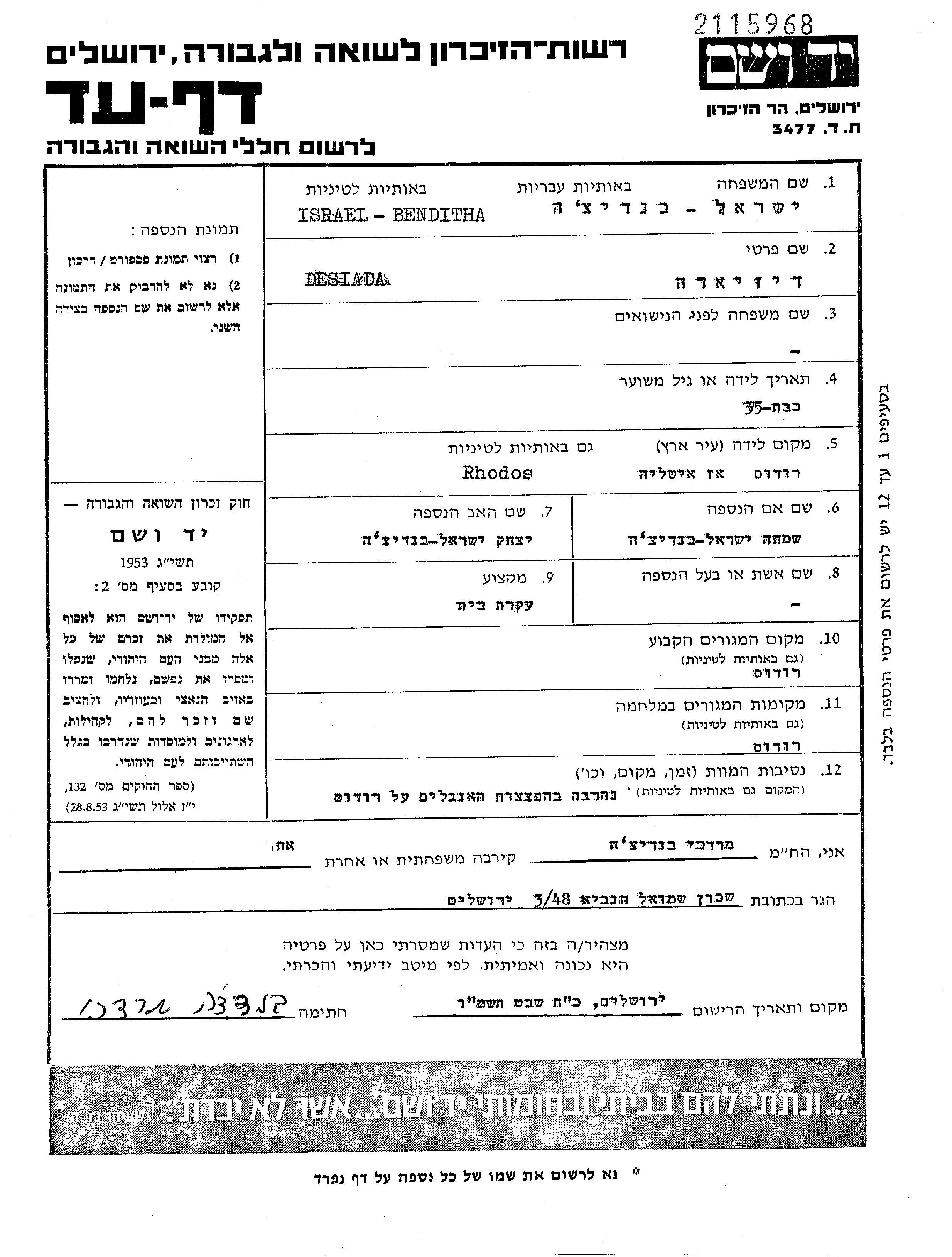 Desiada Israel Benditha est née à Rhodes, Italie, fille de Yitzhak et de Simha née Kamkhi. Elle était Femme au foyer et Célibataire. Avant la seconde guerre mondiale elle vivait à Rhodes, Italie. Pendant la guerre, elle était à Rhodes, Italie.
