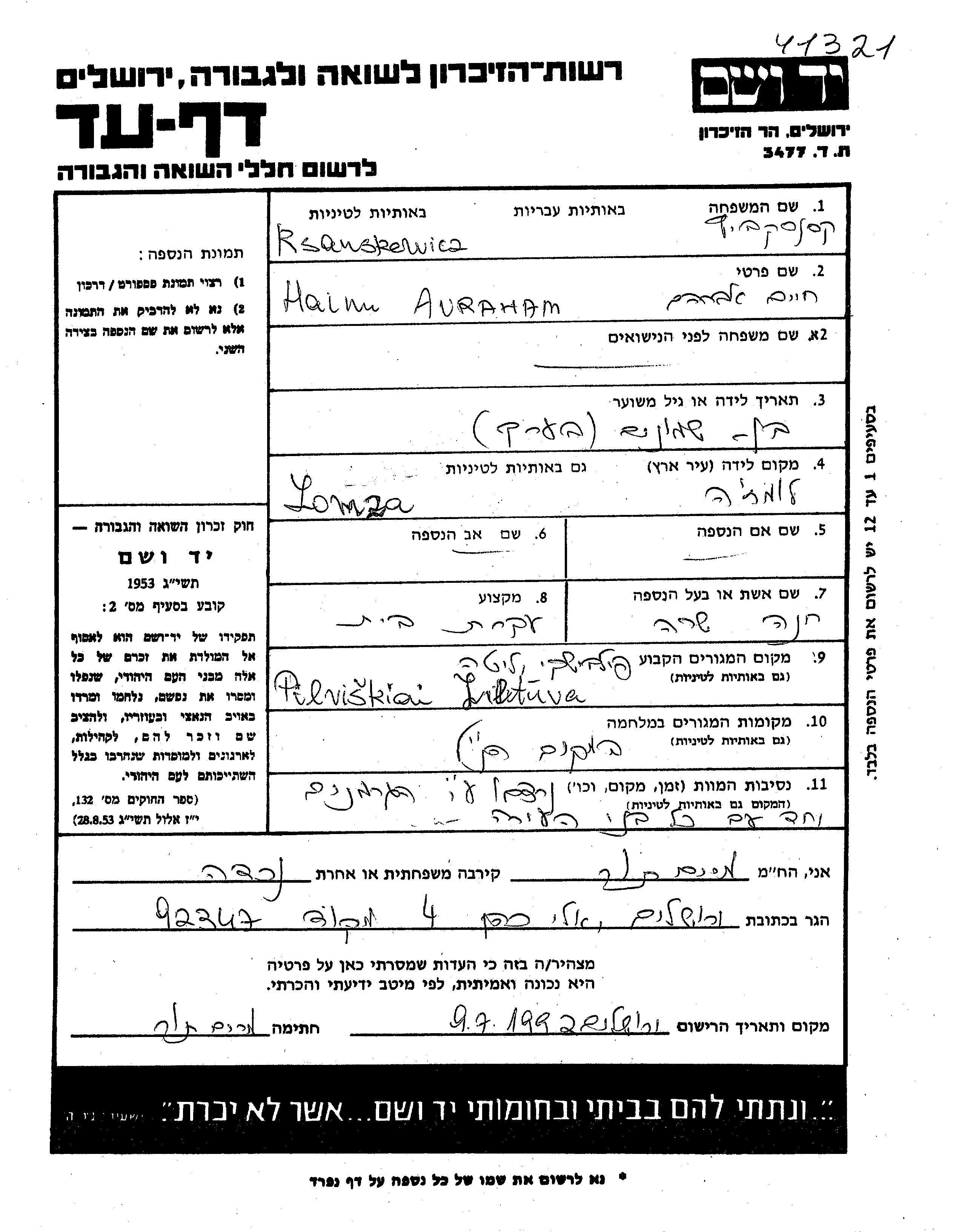 Ksanskewicz Haim Avraham Pilviškiai, Lituanie Feuille de témoignage