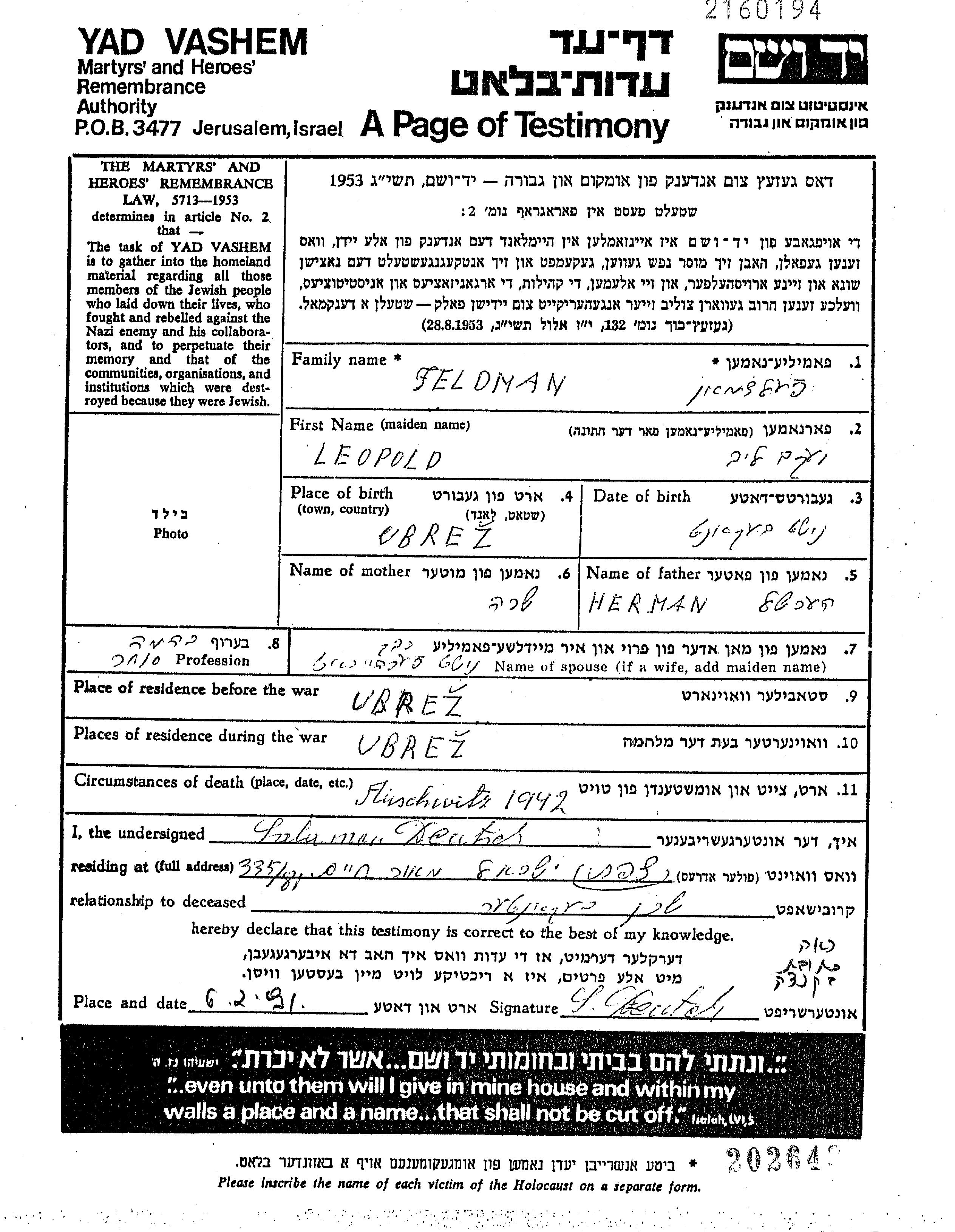 Feldman Yaakov Leib Leopold Ubrez, Tchécoslovaquie Feuille de témoignage