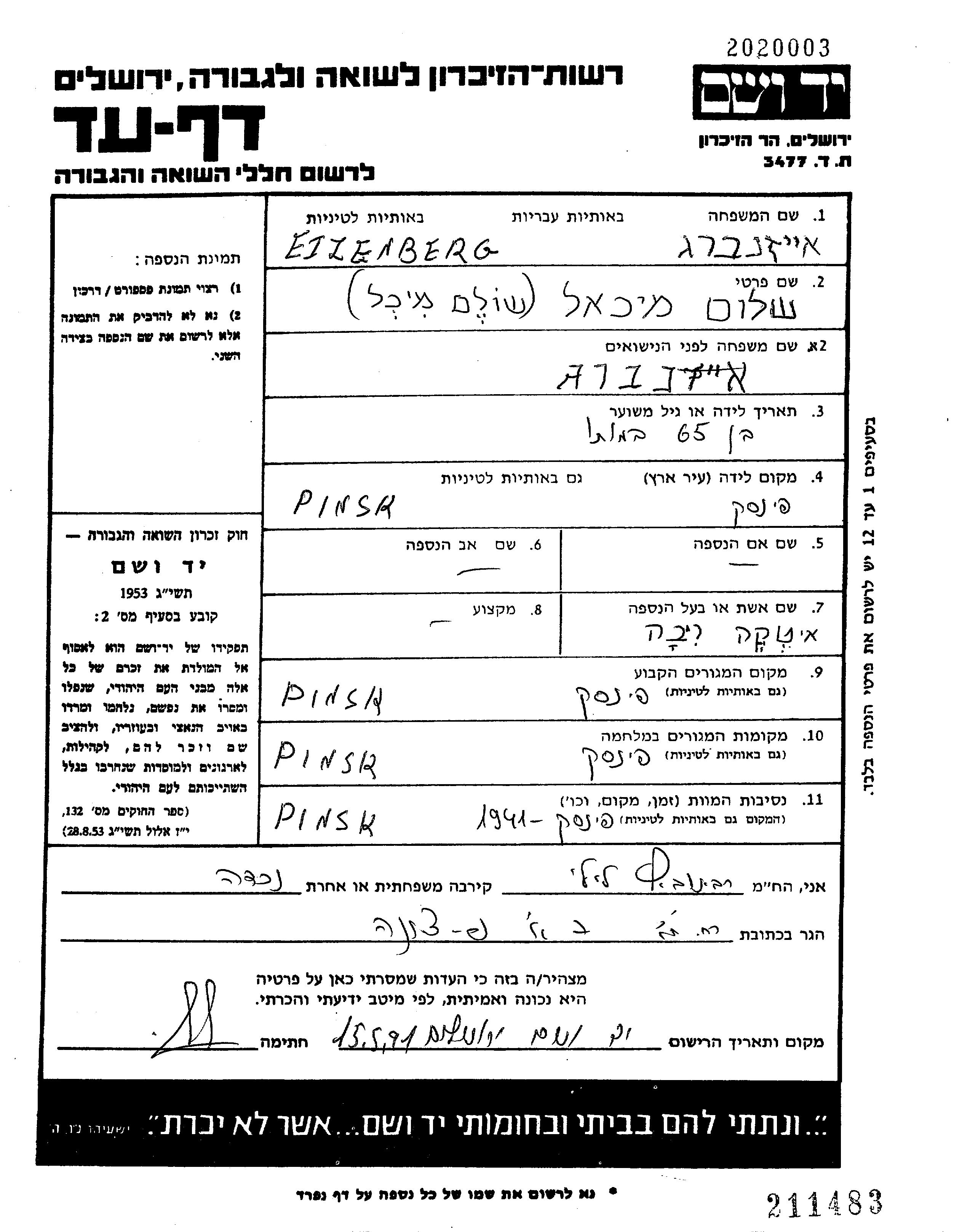 Eizenberg Shalom Mikhl 1876 Pinsk, Pologne Feuille de témoignage