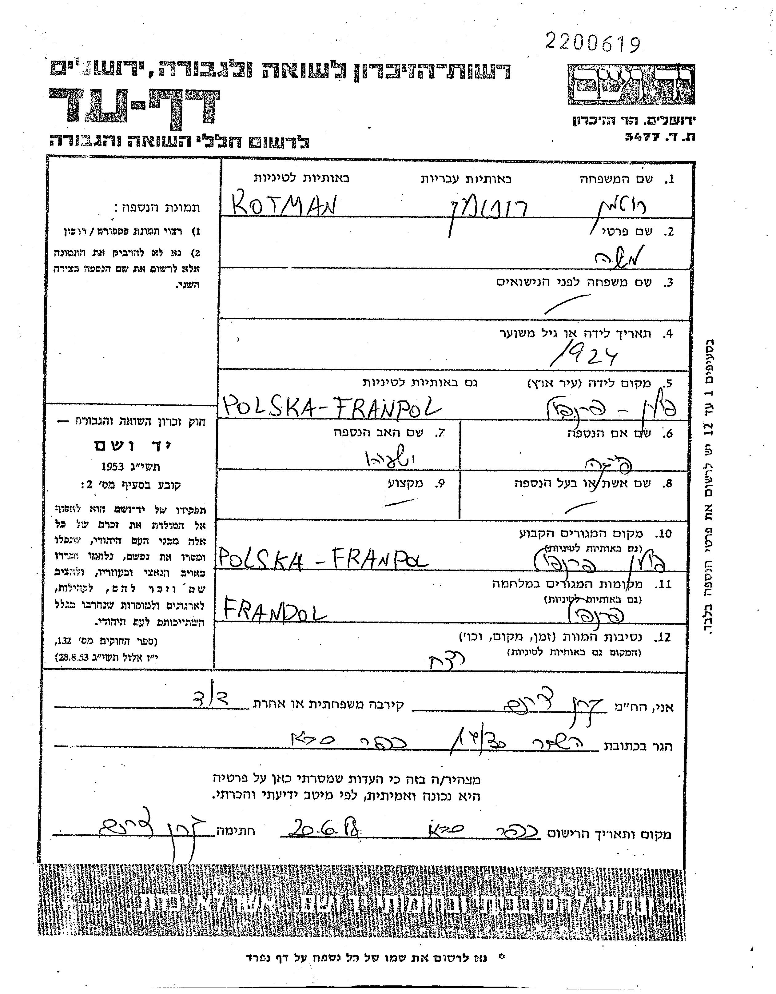 Rotman Moshe 1924 Frampol, Pologne Feuille de témoignage