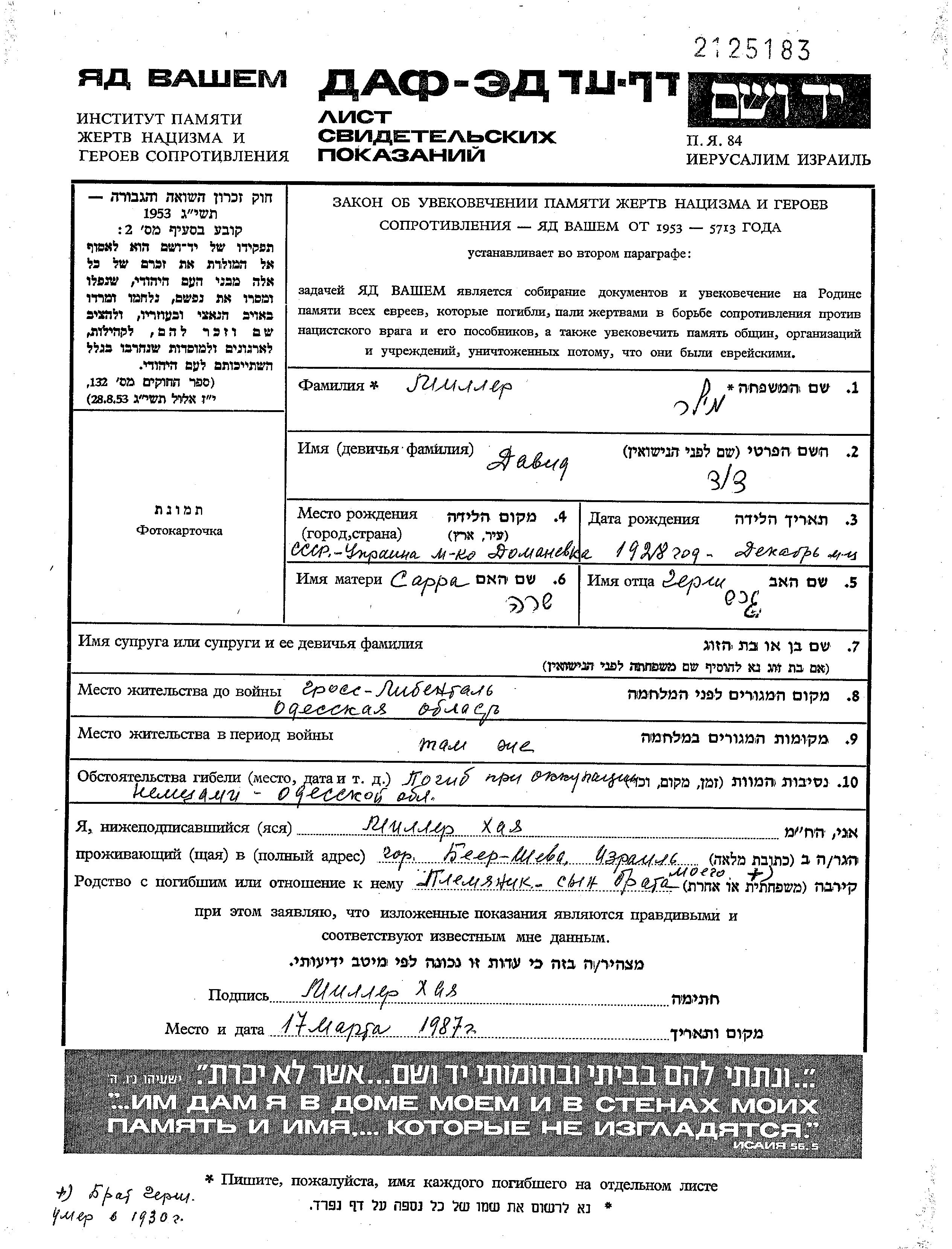 Miller David 1928 Grosslibental, Ukraine (URSS) Feuille de témoignage