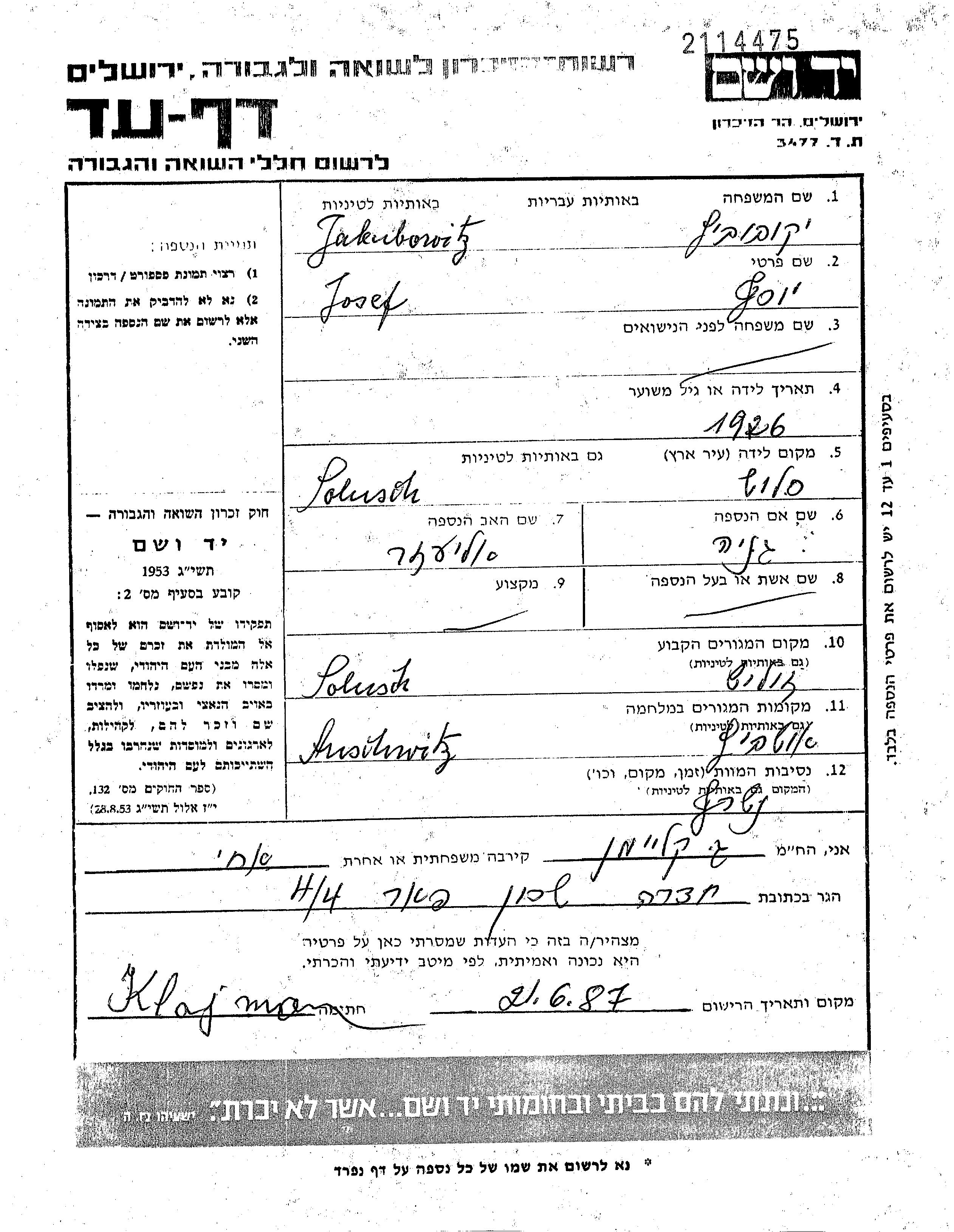 Jakubowitz Josef Szollos, Tchécoslovaquie Feuille de témoignage