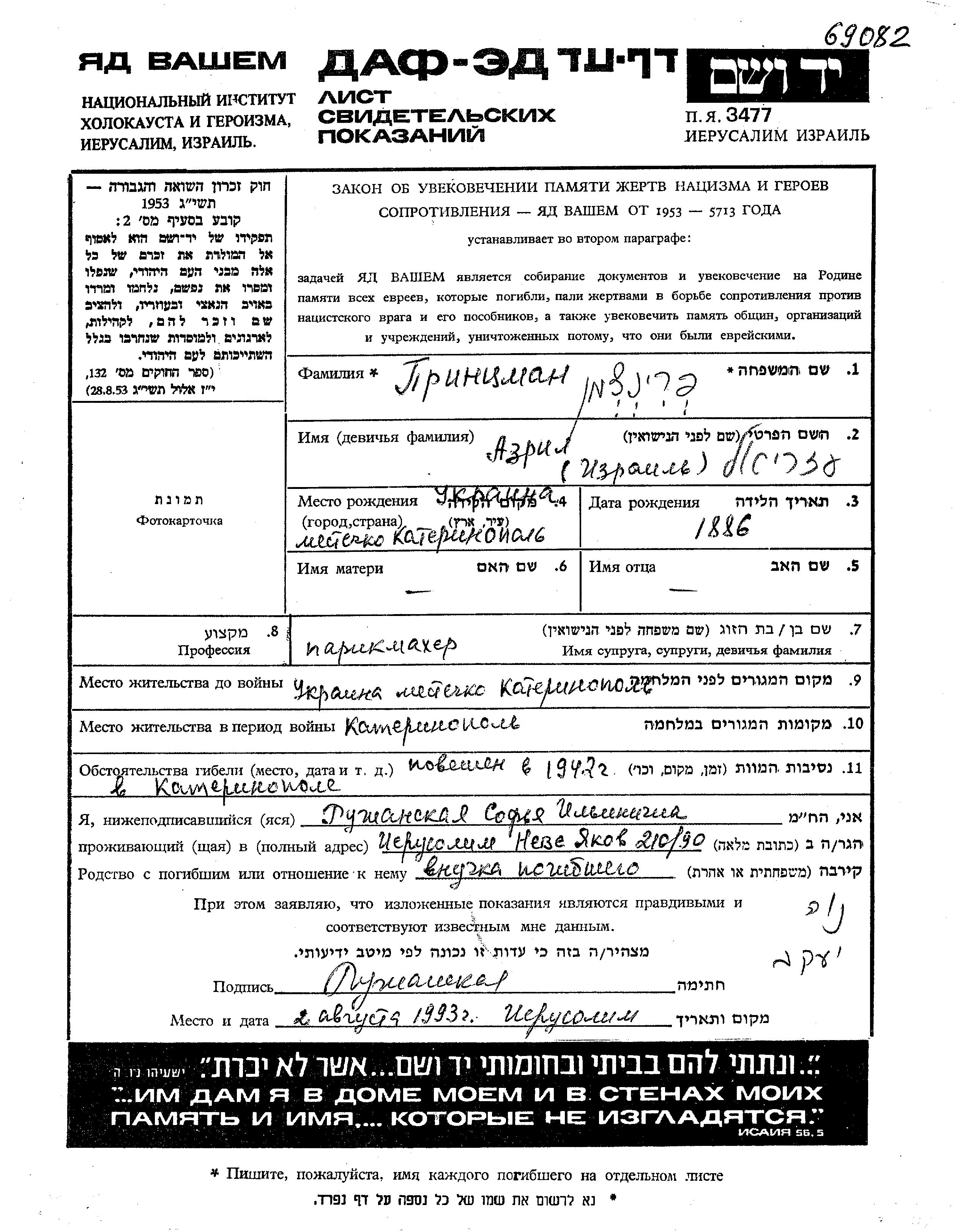 Printzman Azril Izrail 1886 Katerinopol, Ukraine (URSS) Feuille de témoignage
