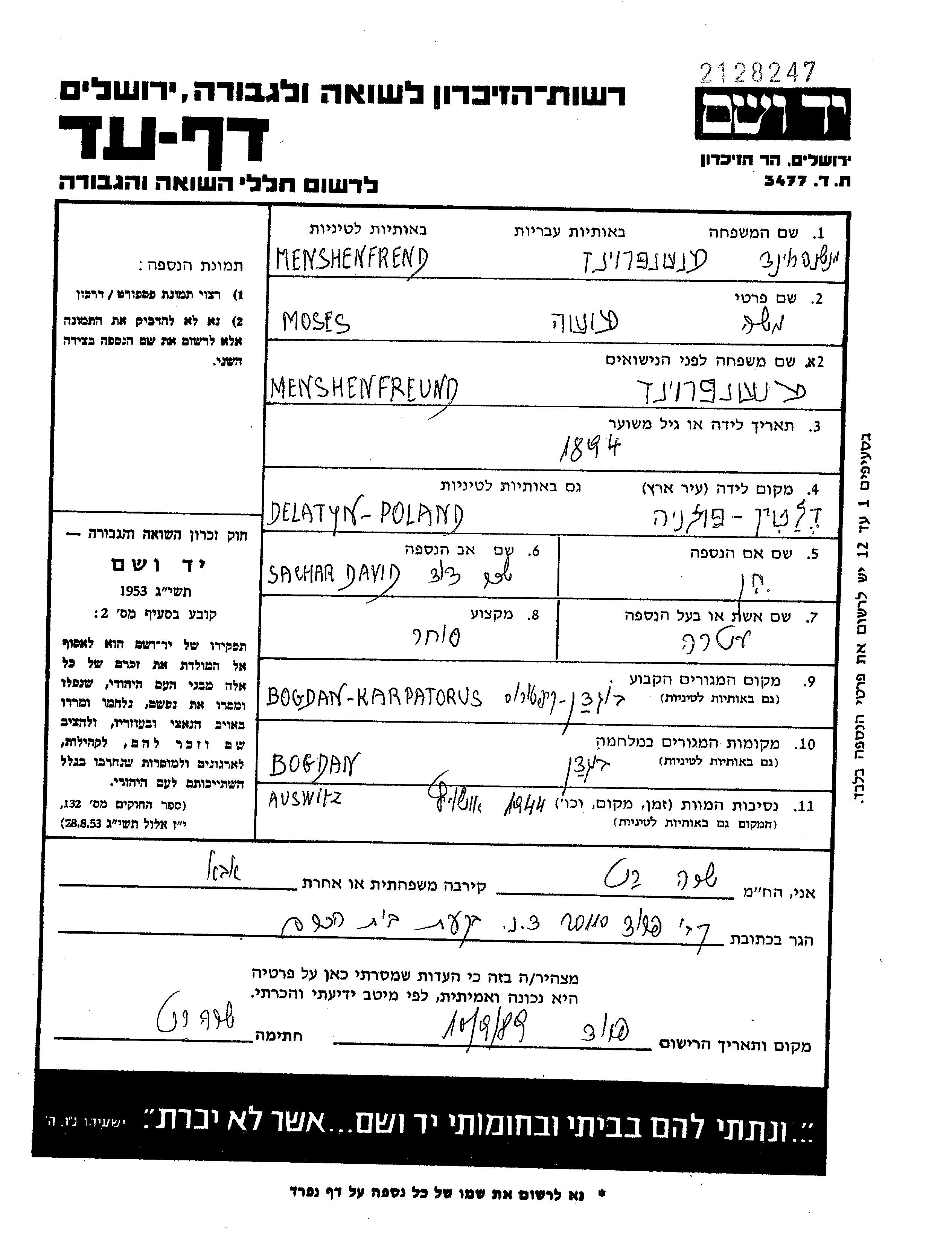 Menshenfroind Moshe Bohdan, Tchécoslovaquie Feuille de témoignage