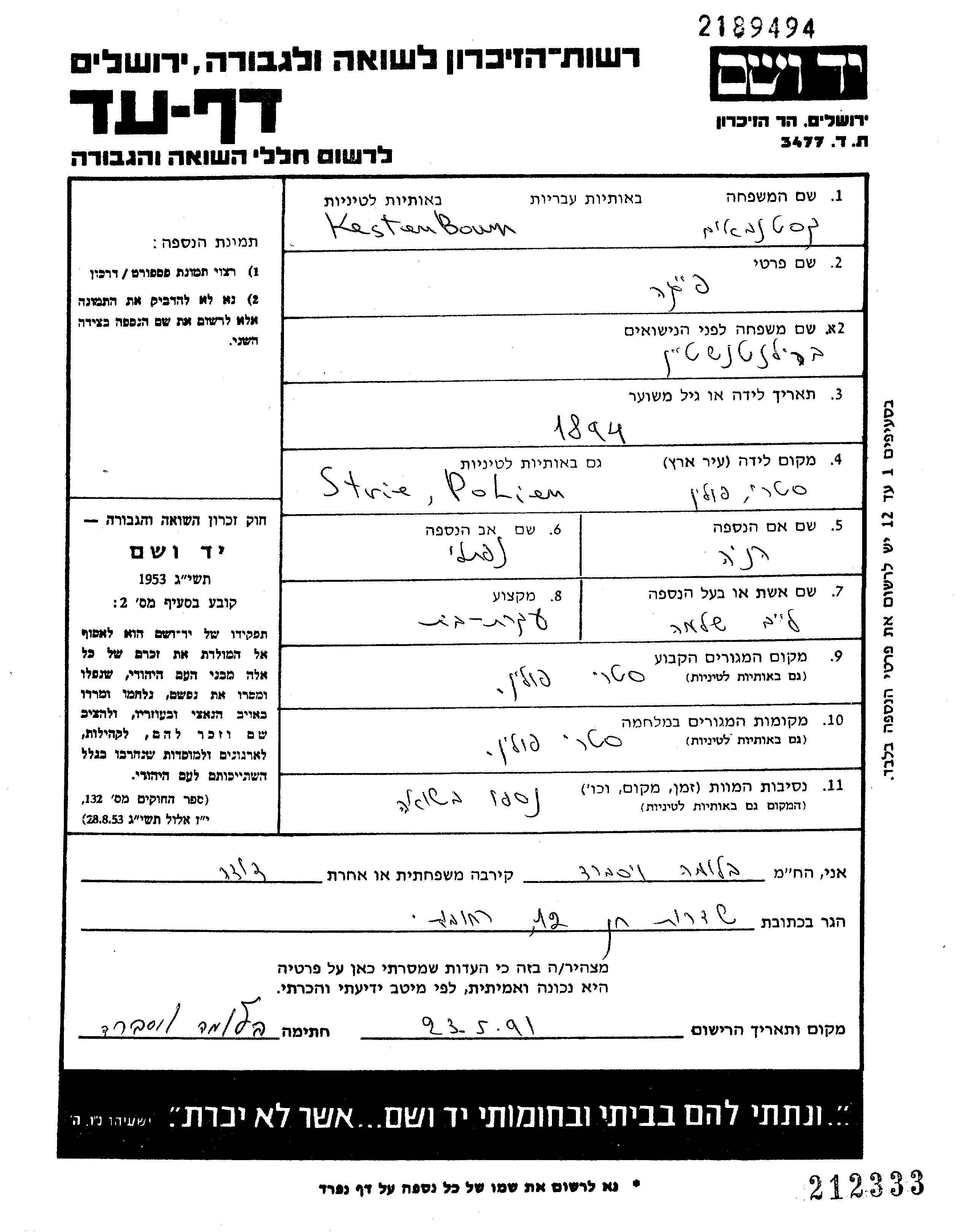 Kestenboum Feiga 1894 Stryj, Pologne Feuille de témoignage
