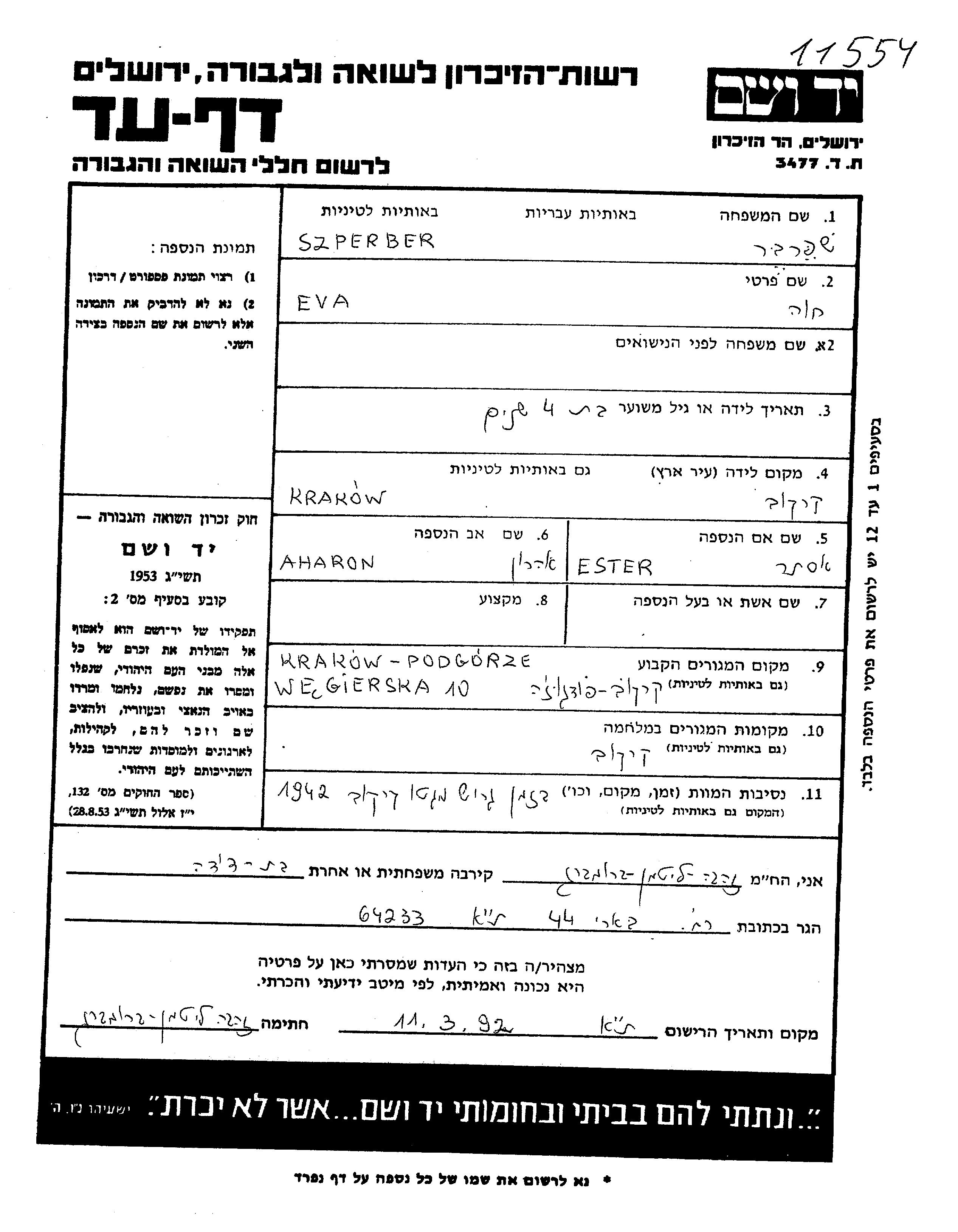 Szperber Khava Eva Krakow, Pologne Feuille de témoignage